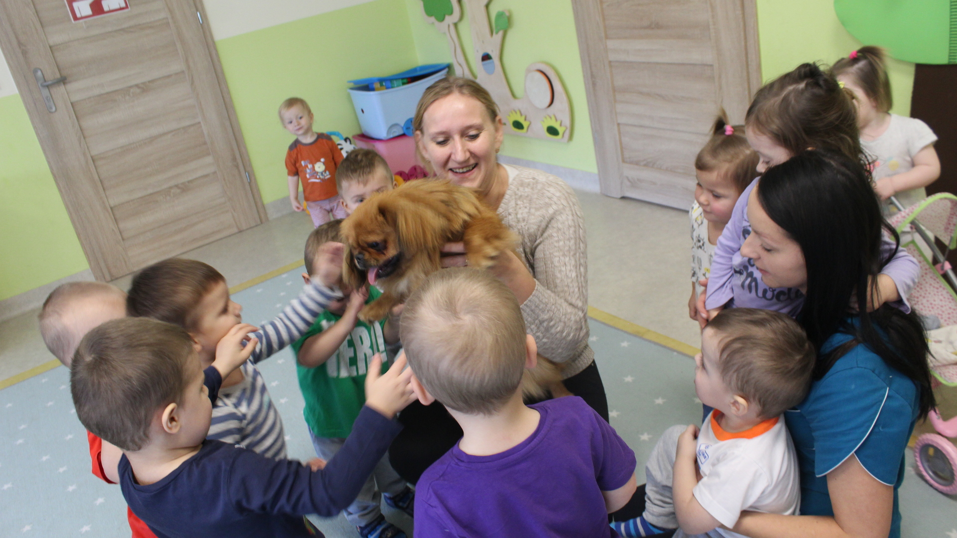 Co jakiś czas w naszym żłobku pojawiają się ciekawi goście, tym razem na dwa dni zawitał do nas kanarek, dzięki któremu od czasu do czasu w sali zabaw było słychać kanarkowe świergotanie… Dzieci oglądały, podziwiały, ale nikt nie mógł kanarka przytulić…. Ale za to kilka dni później ciocia Renata oraz Basia przyprowadziły do Żłobka swoich czworonożnych pupili, którzy w odróżnieniu od kanarka, chętni byli do przytulania i głaskania. Oj było dużo radości…