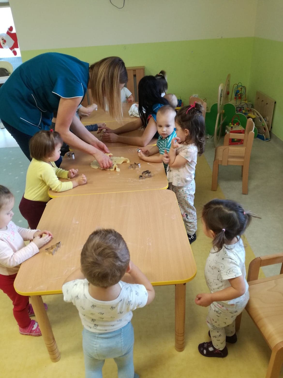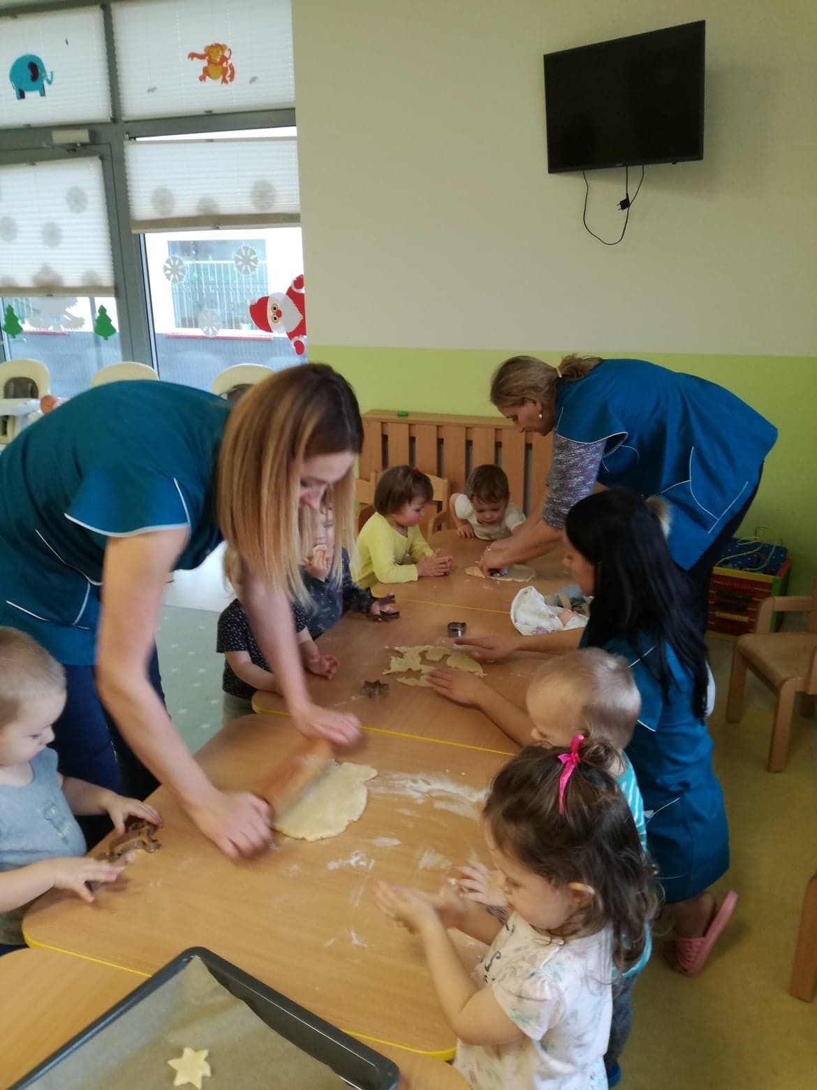 U nas już przygotowania do świąt, w żłobku zrobiło się bardzo świątecznie za sprawą „ciasteczkowej roboty”. W sali zabaw pojawiły się wałki, foremki, ciasto. Ciocie wspólnie z dziećmi robiły świąteczne ciastka. Świetna zabawa, obserwacja, a na koniec degustacja, tak w skrócie przebiegały zajęcia z pieczenia. Ujawniły się też pierwsze zamiłowania i talenty, co widać na załączonych zdjęciach.