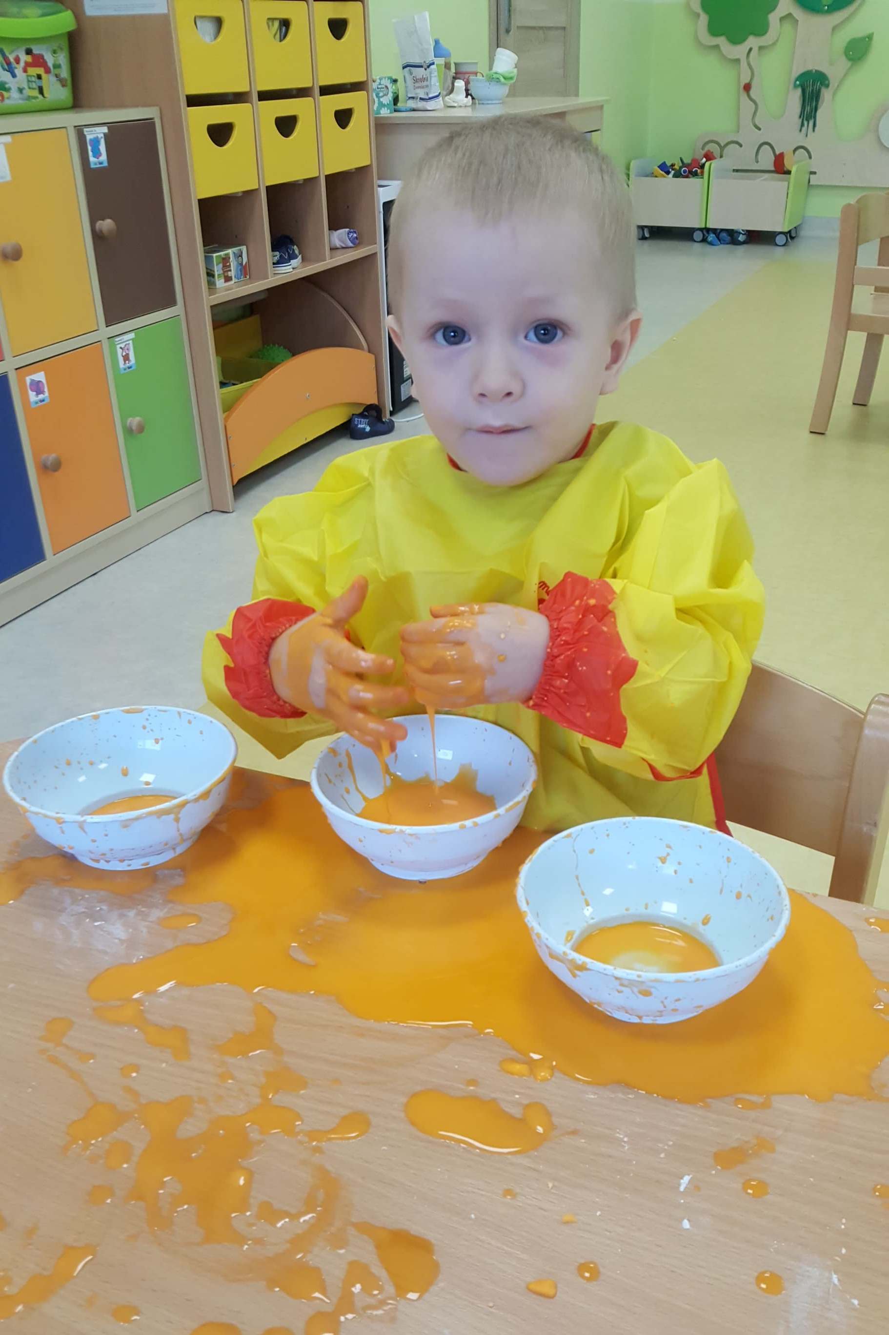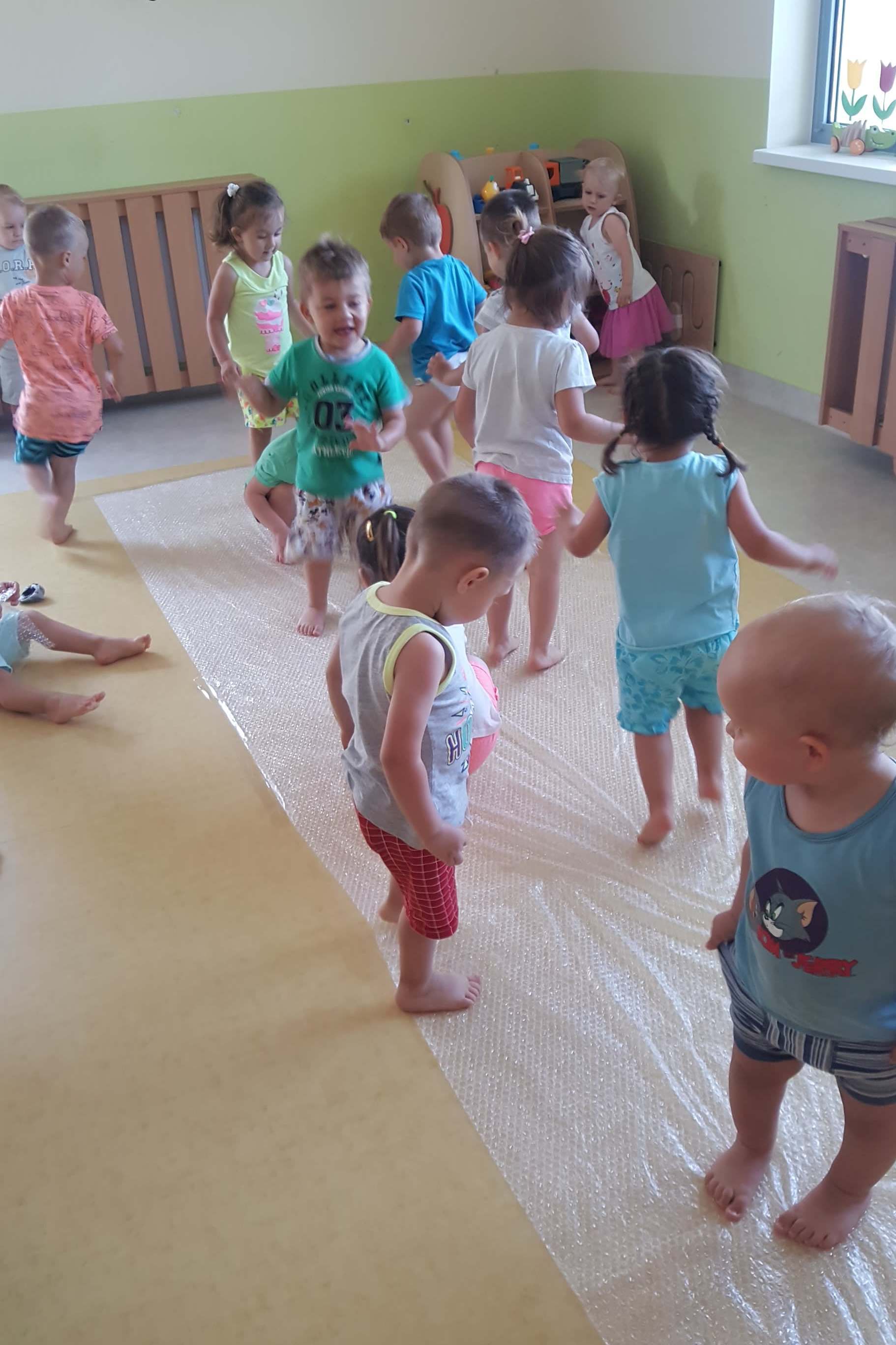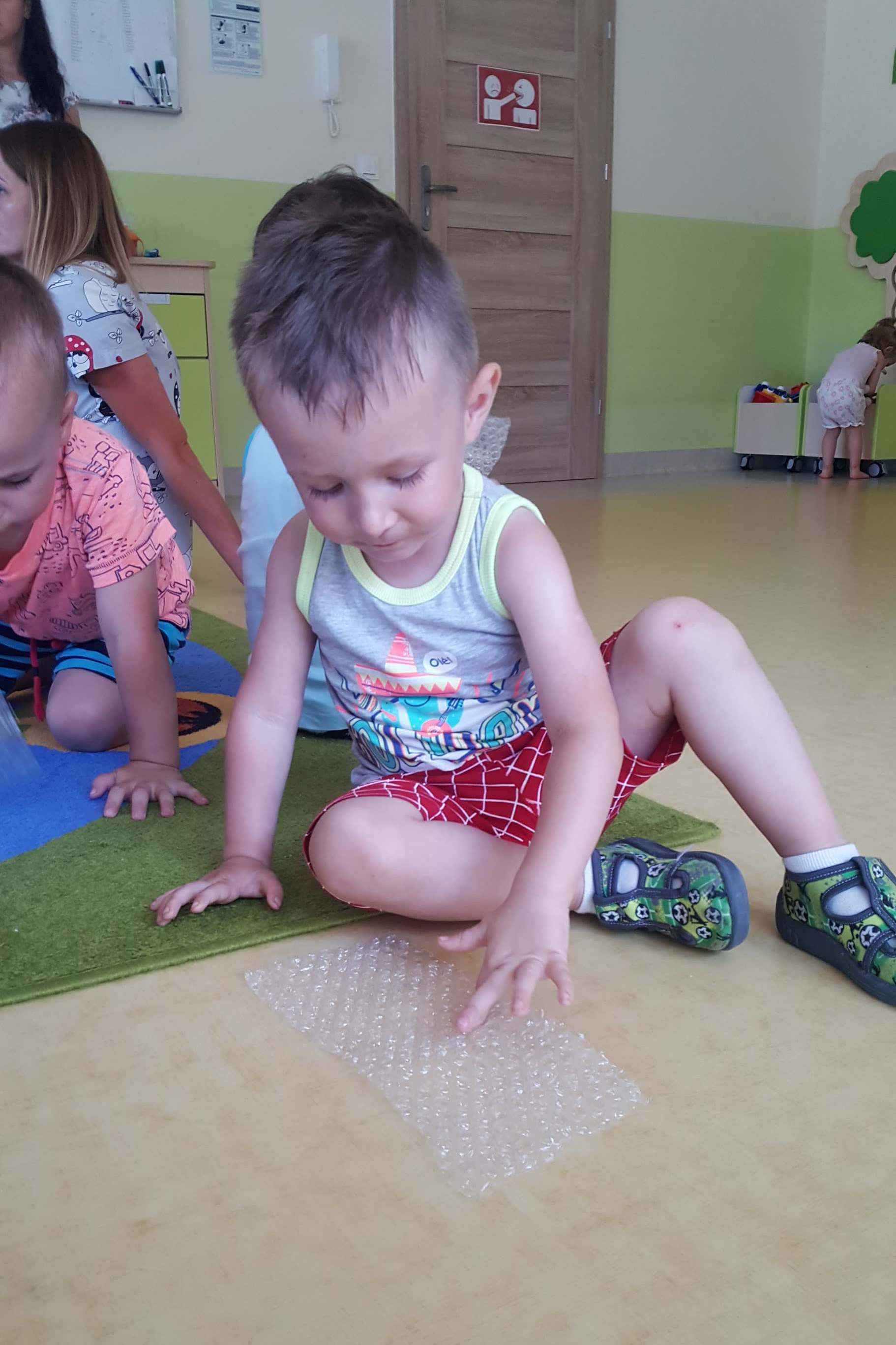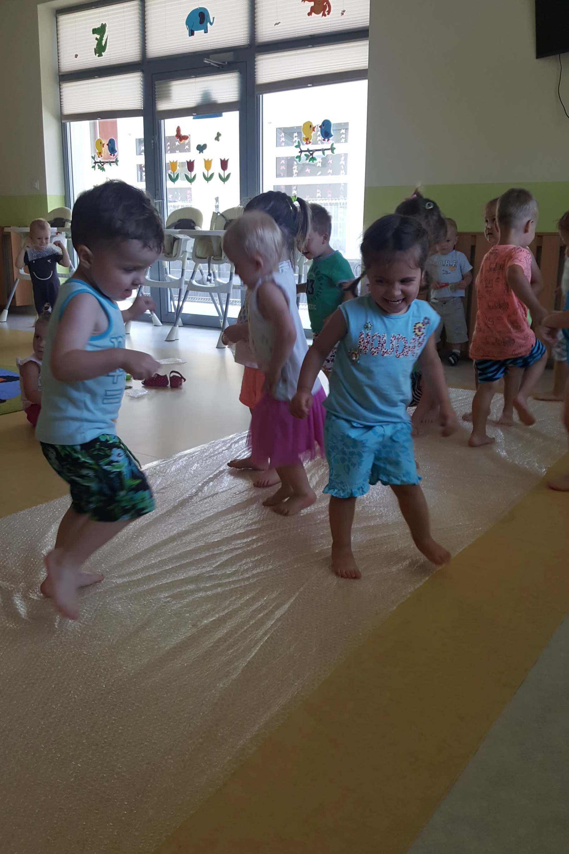 Wakacje już trwają a my wcale nie odpoczywamy. Na zajęciach sensorycznych bawiliśmy się cieczą nienewtonowską, która pod wpływem nacisku zmienia swoje właściwości. Do jej przygotowania wystarczy skrobia ziemniaczana i woda. A jeśli chcemy uzyskać kolor dodajemy barwnik. Trzeba przyznać, że oprócz świetnej zabawy to także miłe odprężenie dla dłoni. Z kolei na kolejnych zajęciach królowała folia bąbelkowa; można było po niej biegać, skakać gołymi stópkami, a potem ściskać w rączkach – jak wiadomo dla naszych żłobkowiczów to były niesamowite doznania. Dzieciaczki były zadowolone, co widać na załączonych zdjęciach.