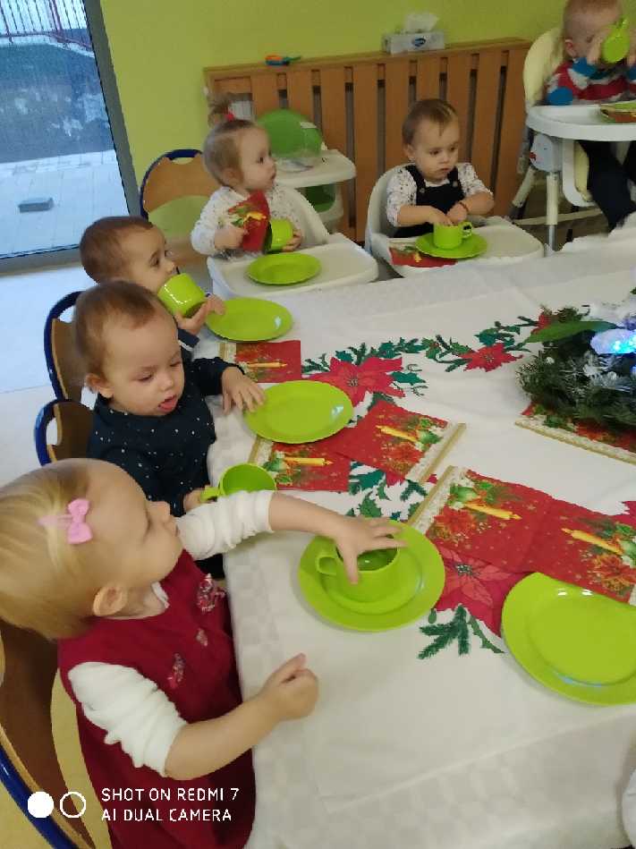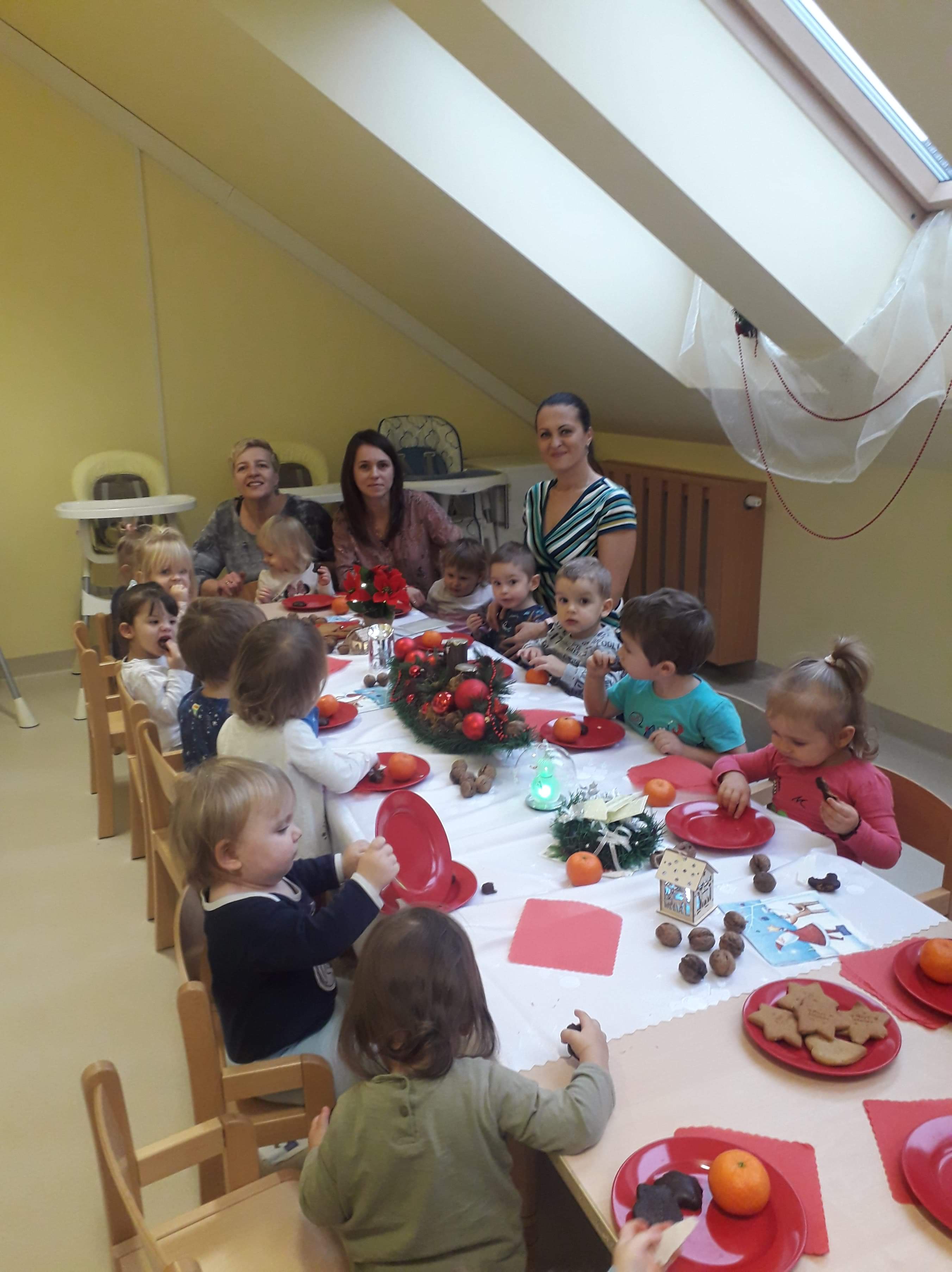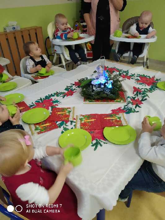 Zanim zaświeci pierwsza gwiazda i nasze maluszki zasiądą z rodzicami przy wigilijnym stole, zaprosiliśmy ich do udziału w żłobkowej wigilii. Było uroczyście, świątecznie, na stole nie zabrakło opłatka i uśmiechu na buziach dzieci. Ciocie zadbały o wystrój, by już dziś można było poczuć magię zbliżających się świąt…