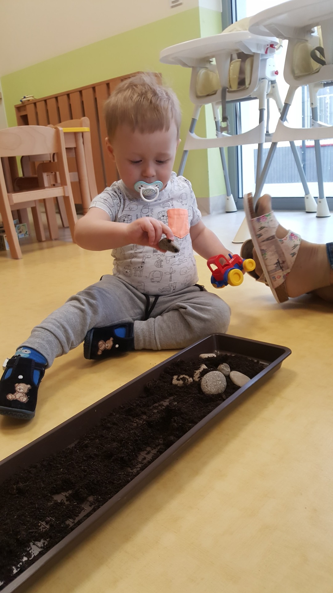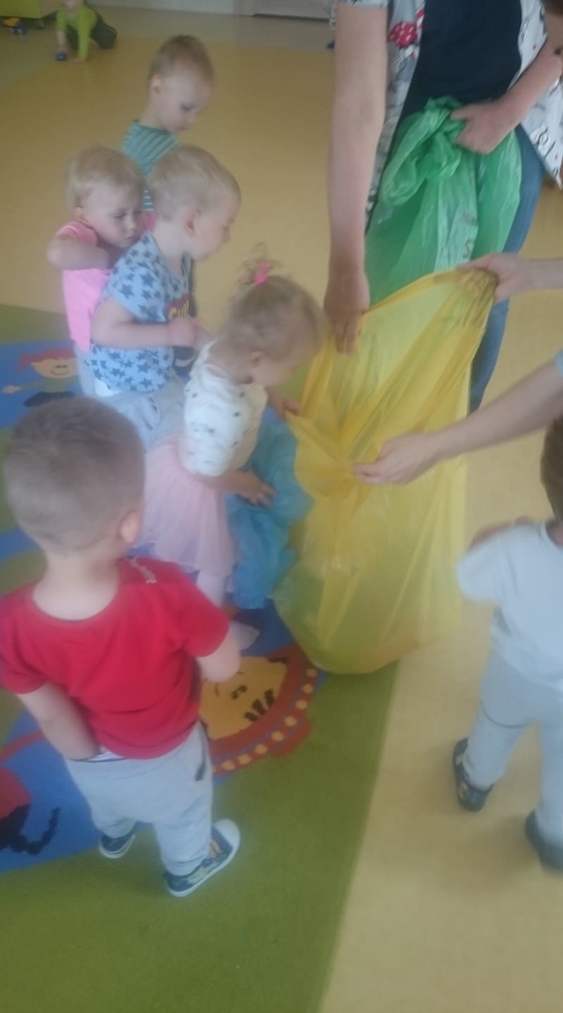 W majowy dzień sala żłobkowa zamieniła się w piękną łąkę, w ruch poszły pędzle i farba … Wiosenna łąka prezentowała się znakomicie! Następnie w sali zabaw pojawił się piasek, kamyki, ziemia. Można było dotykać, bawić się, doświadczać a potem przyszedł czas na wiosenne porządki… Dzieci uczyły się segregować śmieci...