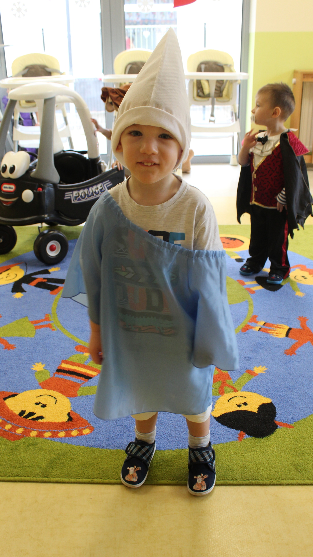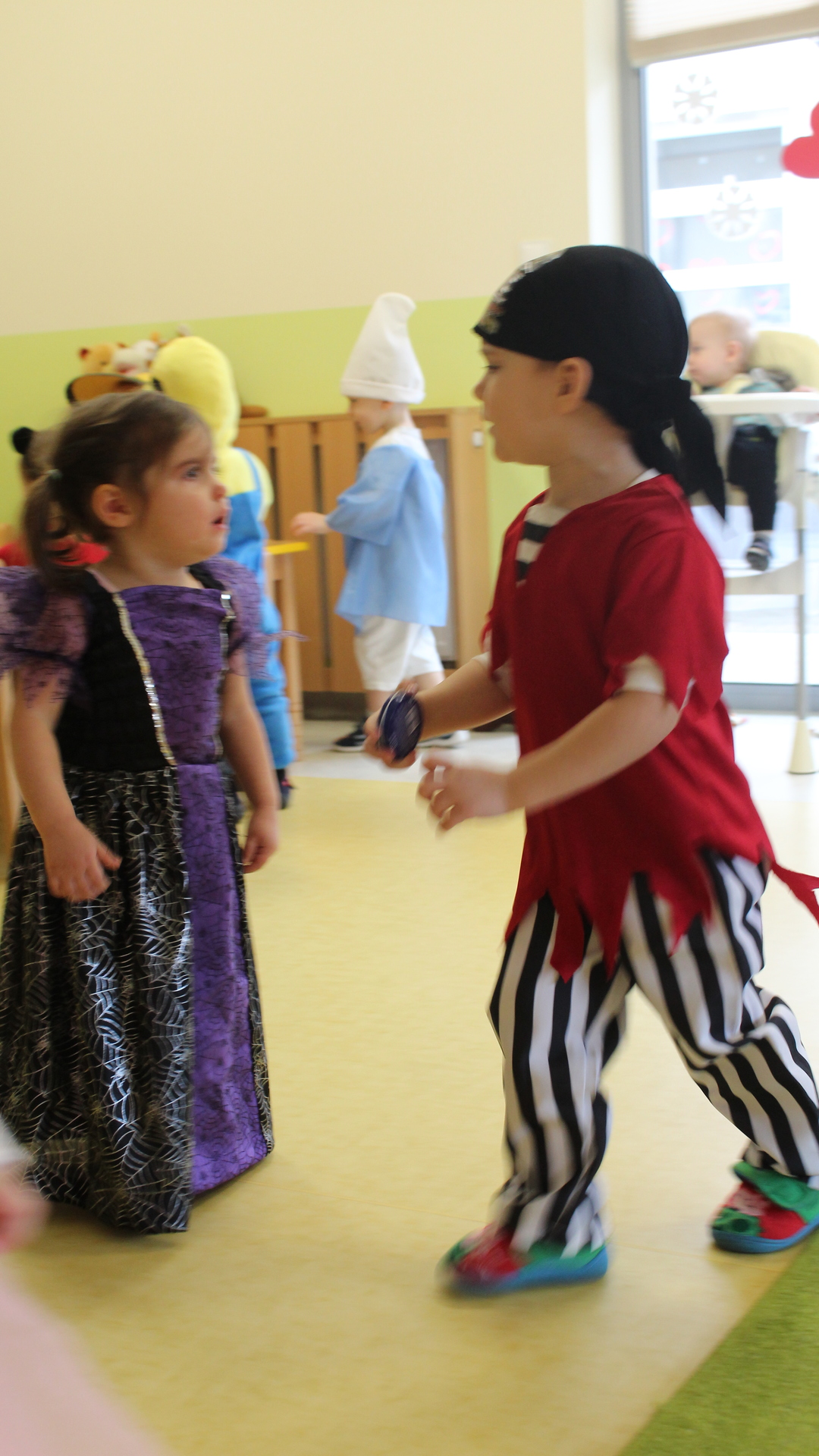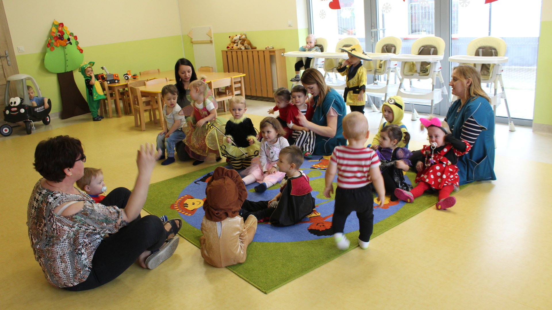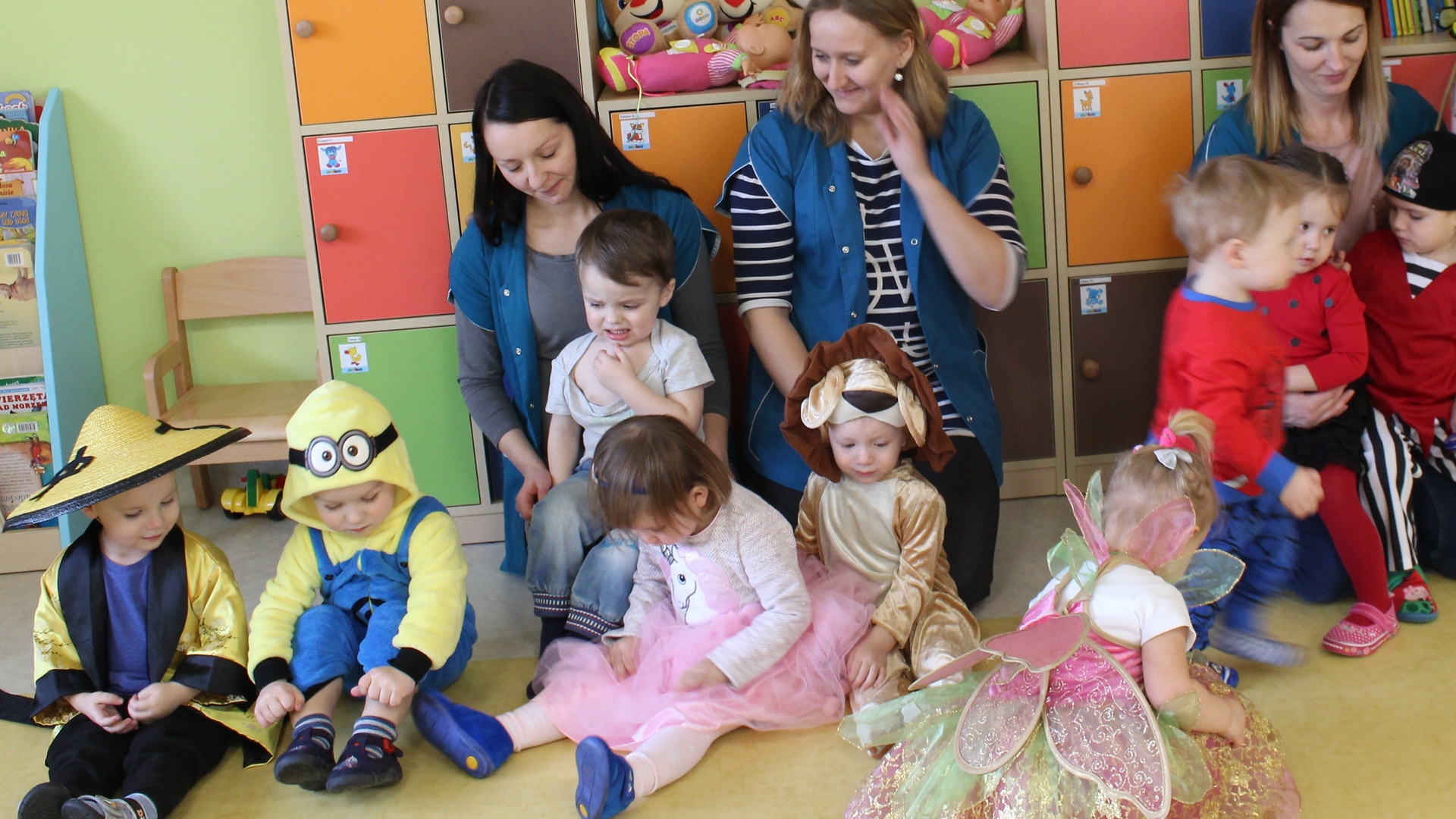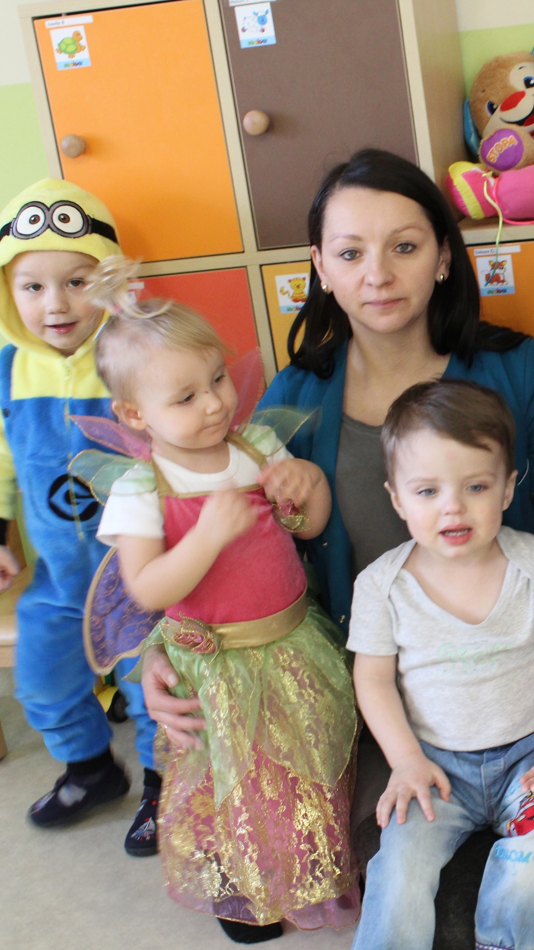 Podczas tegorocznej zabawy karnawałowej w Żłobku w „Bajkowej Krainie” pojawili się niezwykli goście: zielony smok, lew, pszczółka, biedroneczki, motylek, hrabia Dracula, smerf, piraci, księżniczki, Minionek, spiderman, Myszka Miki, nawet gościliśmy małego Chińczyka a wszystkiego pilnował mały policjant. Żłobkowicze w tym dniu wyglądali uroczo a przebrania były naprawdę wyjątkowe. Wszystkiemu towarzyszyła dobra muzyka, zabawy, chusta animacyjna i drobny poczęstunek dla dzieci.
