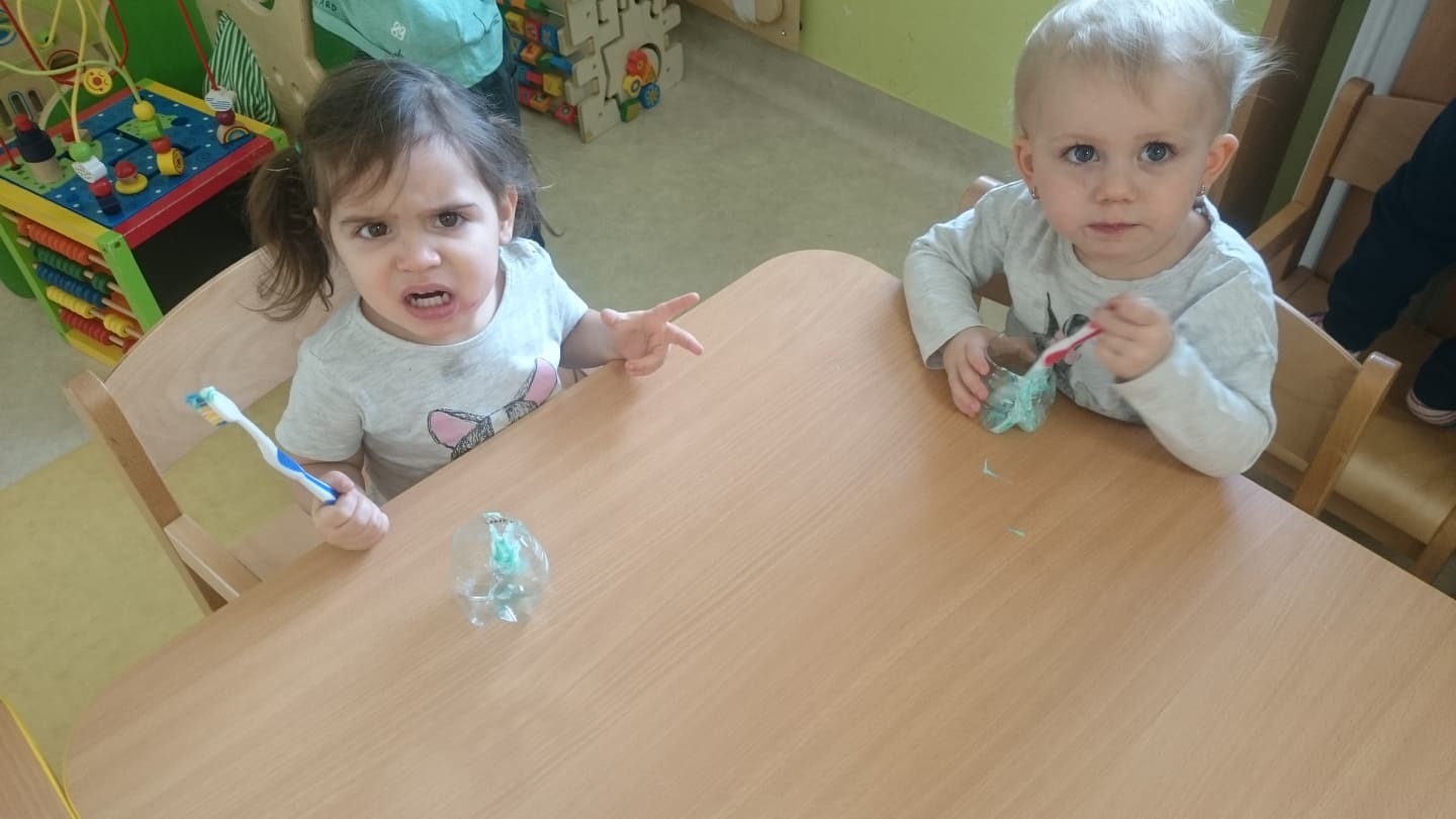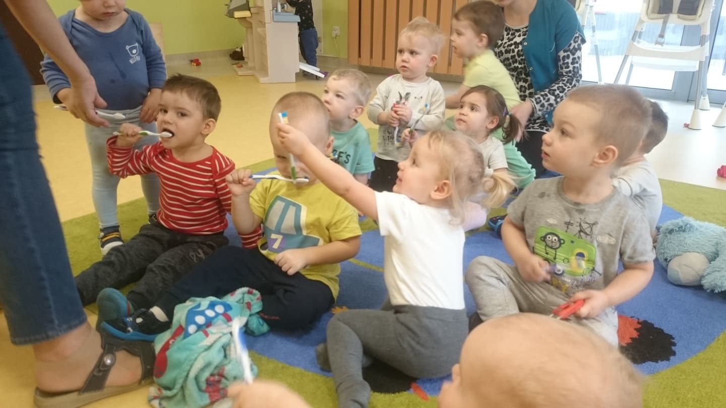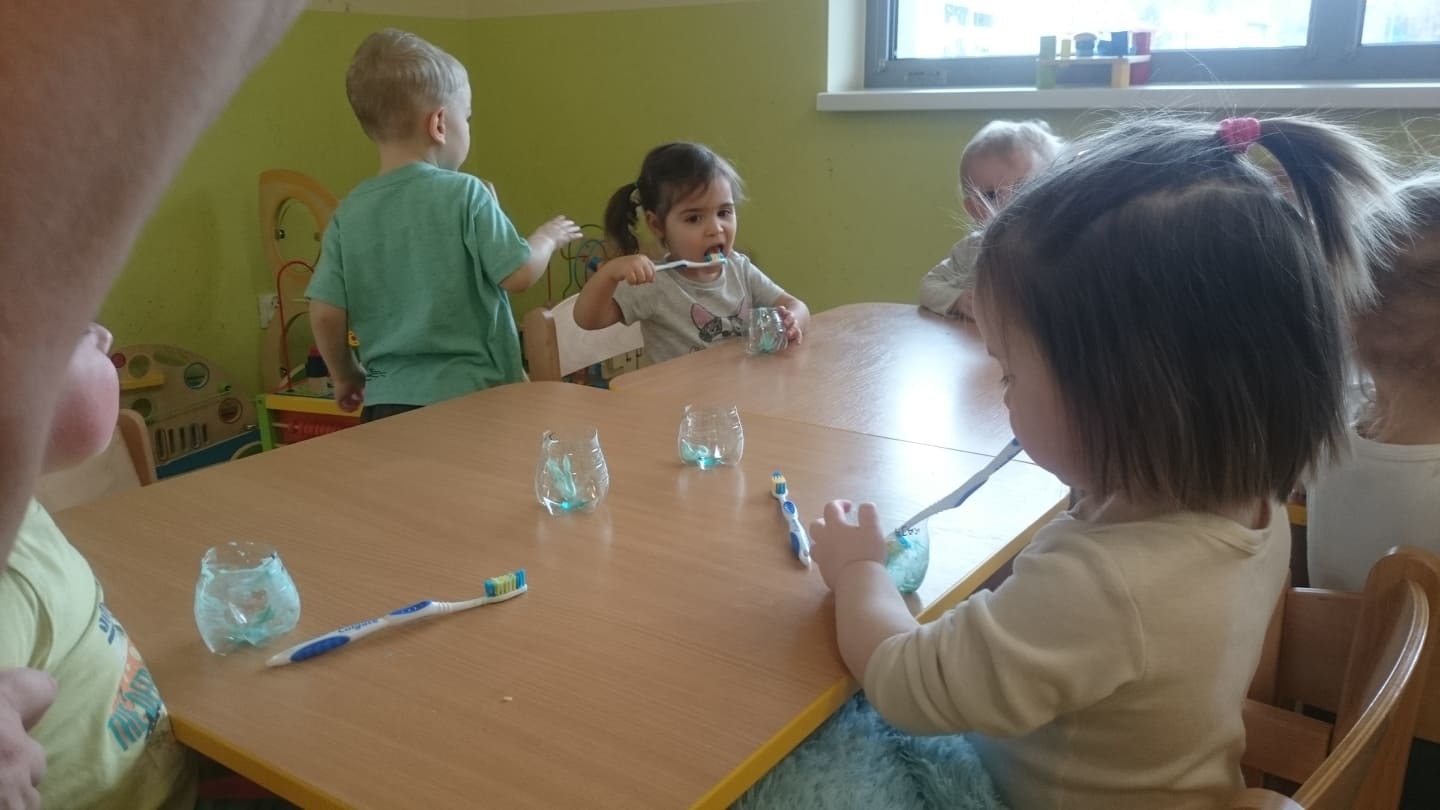Dla naszych podopiecznych kolejny rok pobytu w żłobku to czas zdobywania nowych umiejętności oraz wzmacniania dobrych nawyków. Ostatnio dzieci uczestniczyły w treningu czystości. Ciocie zwróciły uwagę, jak ważne podczas codziennej higieny, jest mycie zębów. Zatem w ruch poszły pasty i szczoteczki do zębów. Najpierw odbyło się szczotkowanie zębów a potem świetna zabawa...