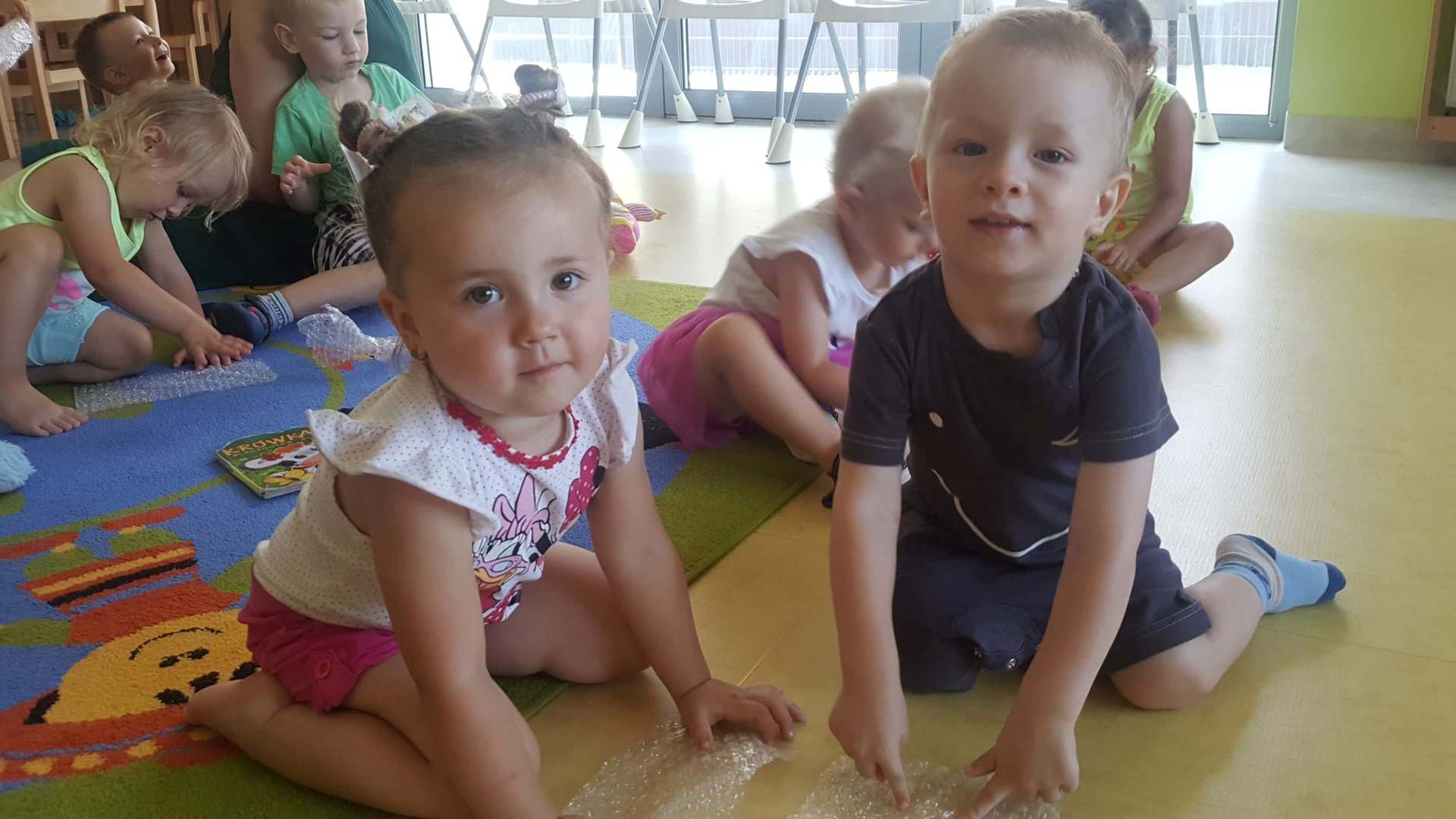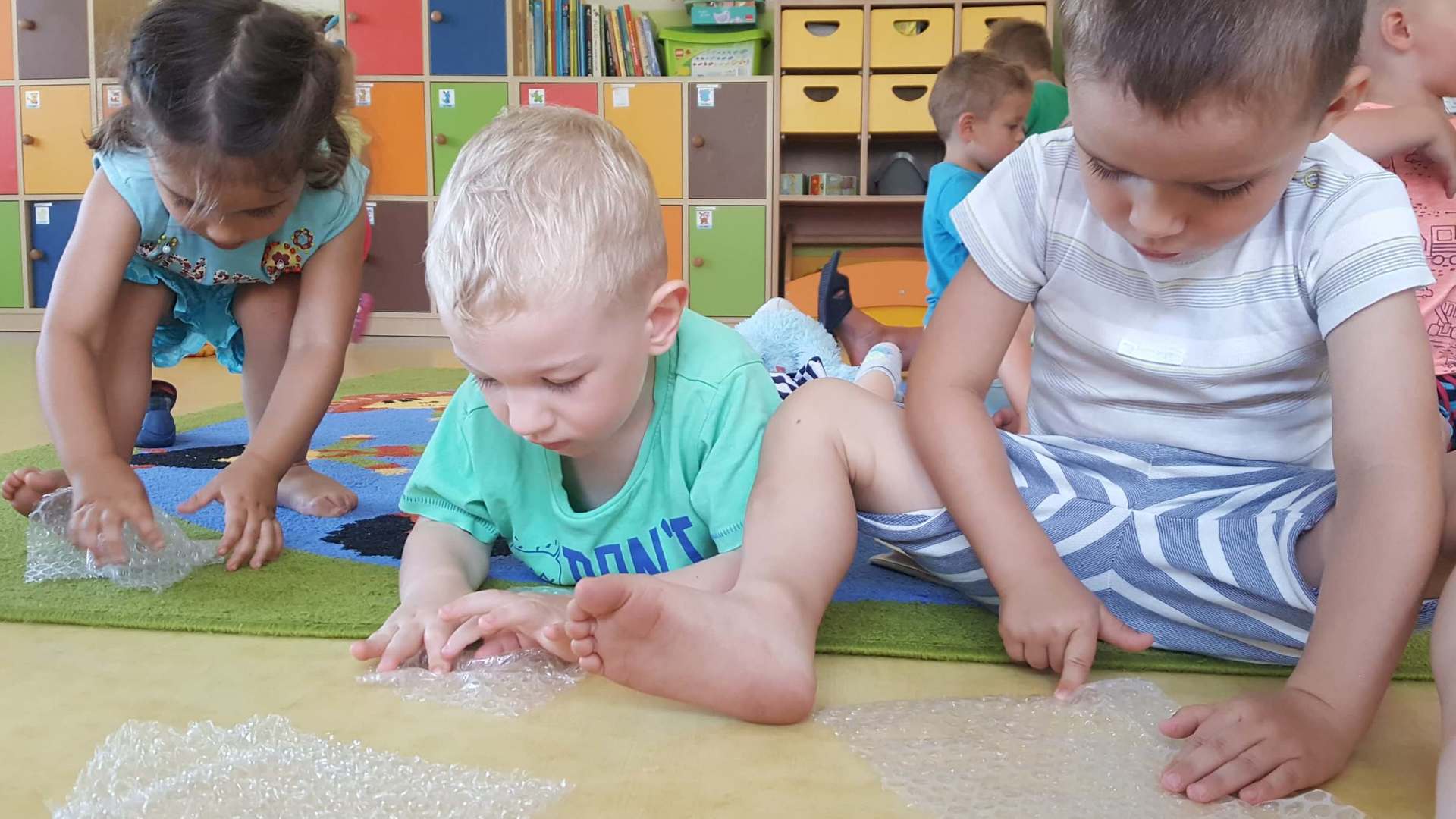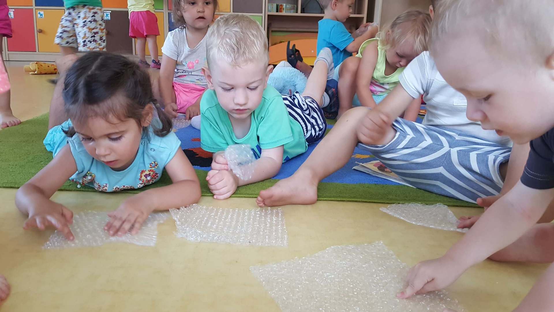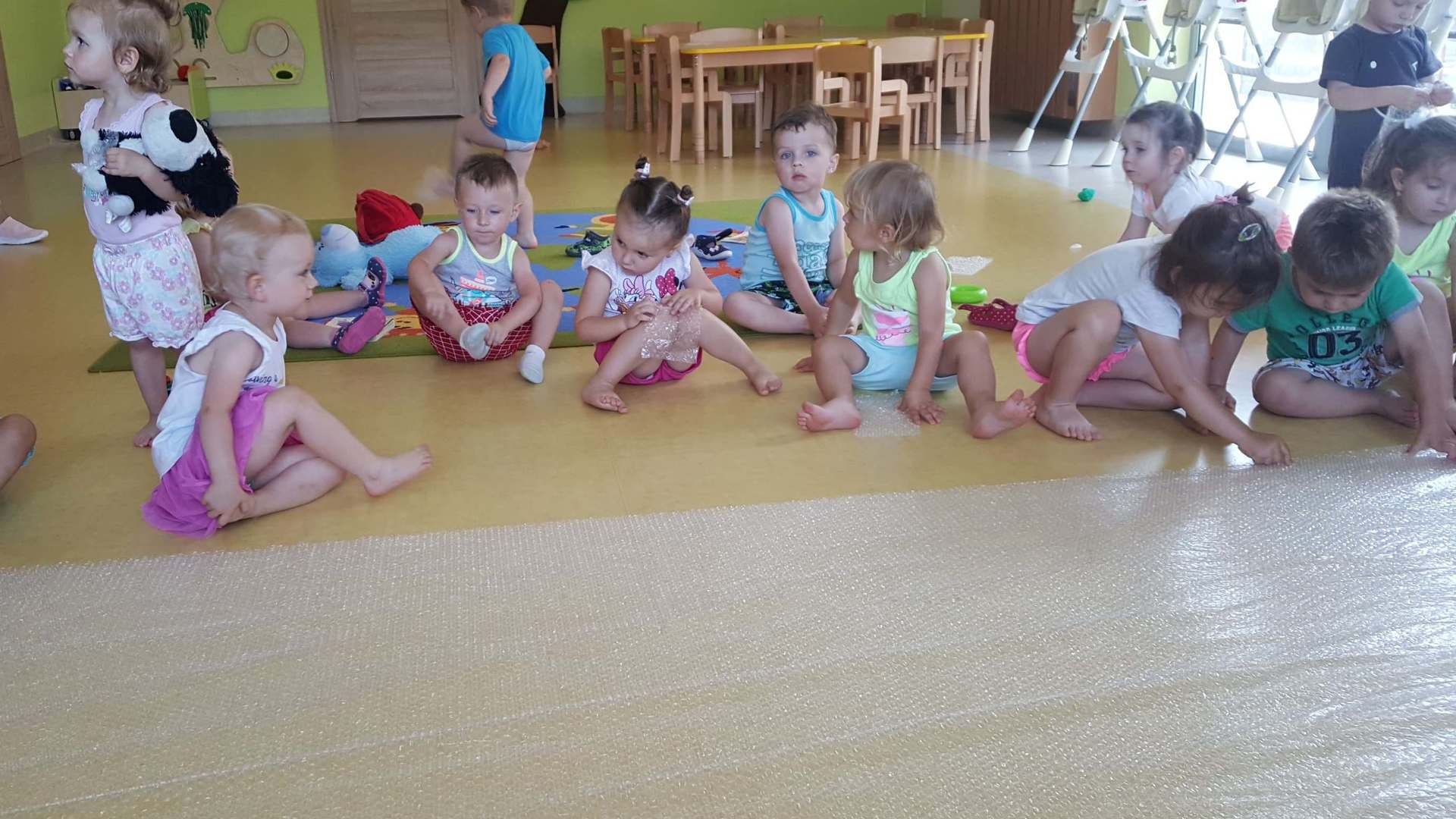Wakacje już trwają a my wcale nie odpoczywamy. Na zajęciach sensorycznych bawiliśmy się cieczą nienewtonowską, która pod wpływem nacisku zmienia swoje właściwości. Do jej przygotowania wystarczy skrobia ziemniaczana i woda. A jeśli chcemy uzyskać kolor dodajemy barwnik. Trzeba przyznać, że oprócz świetnej zabawy to także miłe odprężenie dla dłoni. Z kolei na kolejnych zajęciach królowała folia bąbelkowa; można było po niej biegać, skakać gołymi stópkami, a potem ściskać w rączkach – jak wiadomo dla naszych żłobkowiczów to były niesamowite doznania. Dzieciaczki były zadowolone, co widać na załączonych zdjęciach.