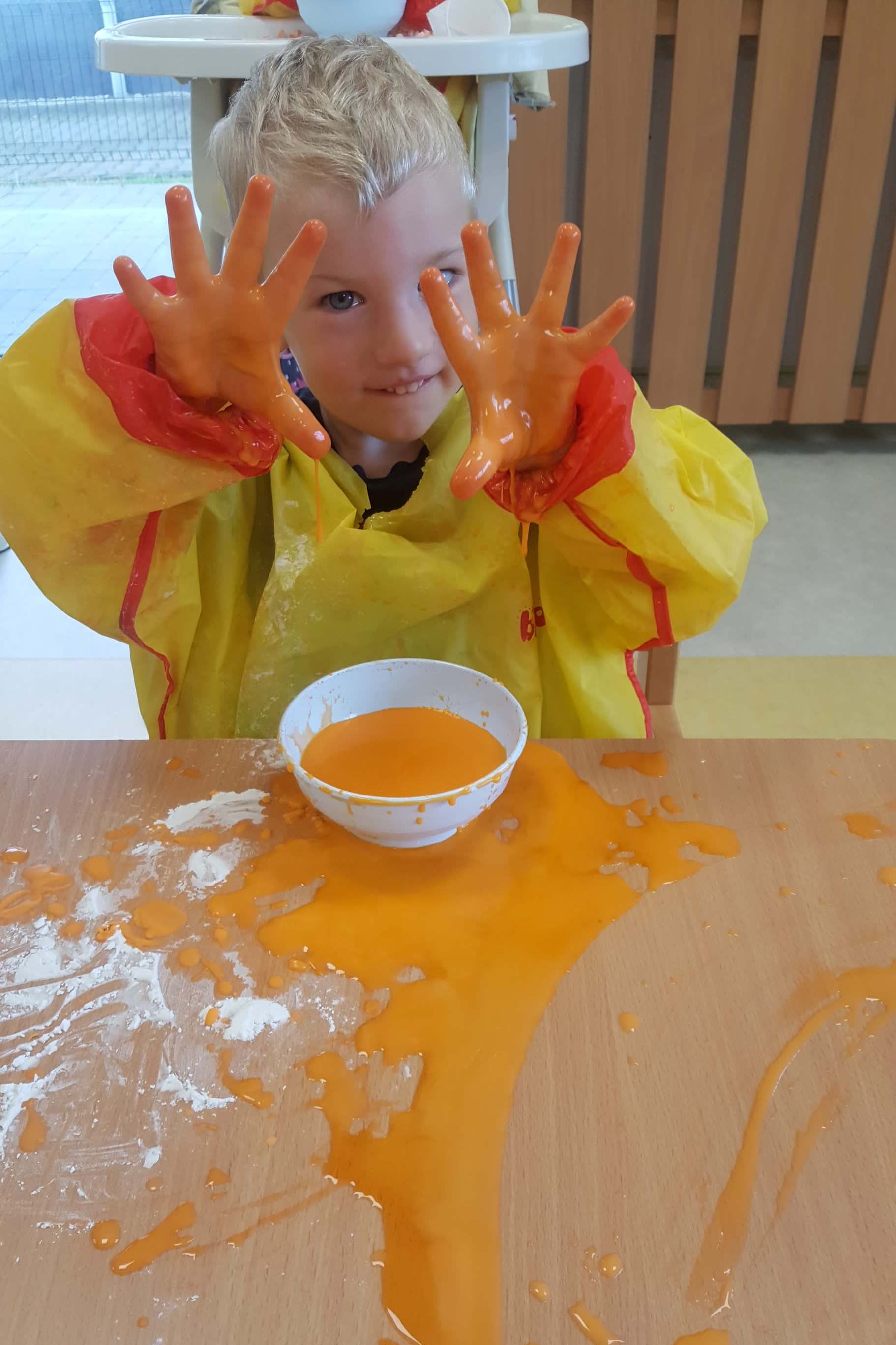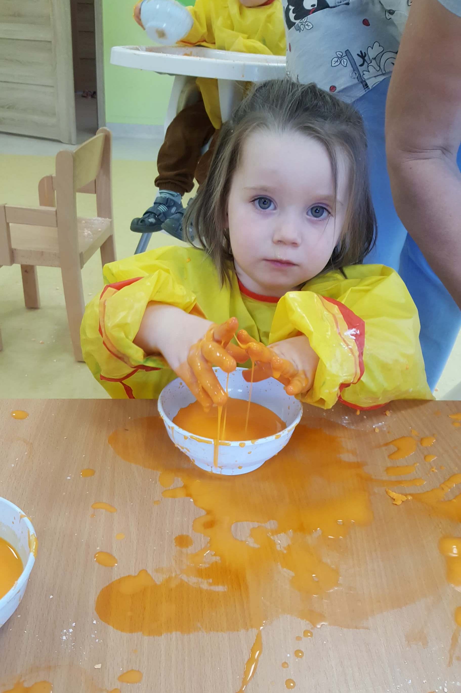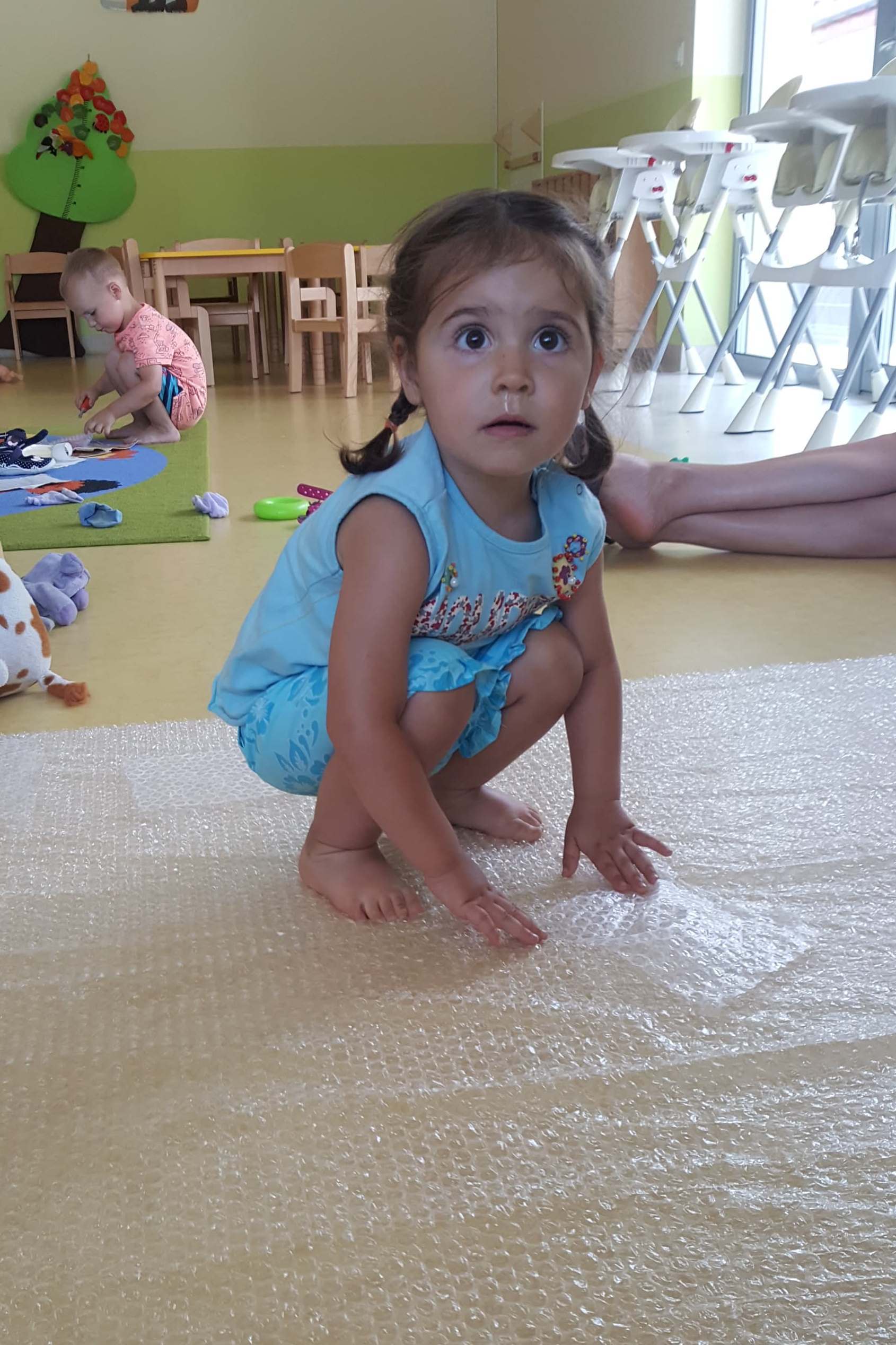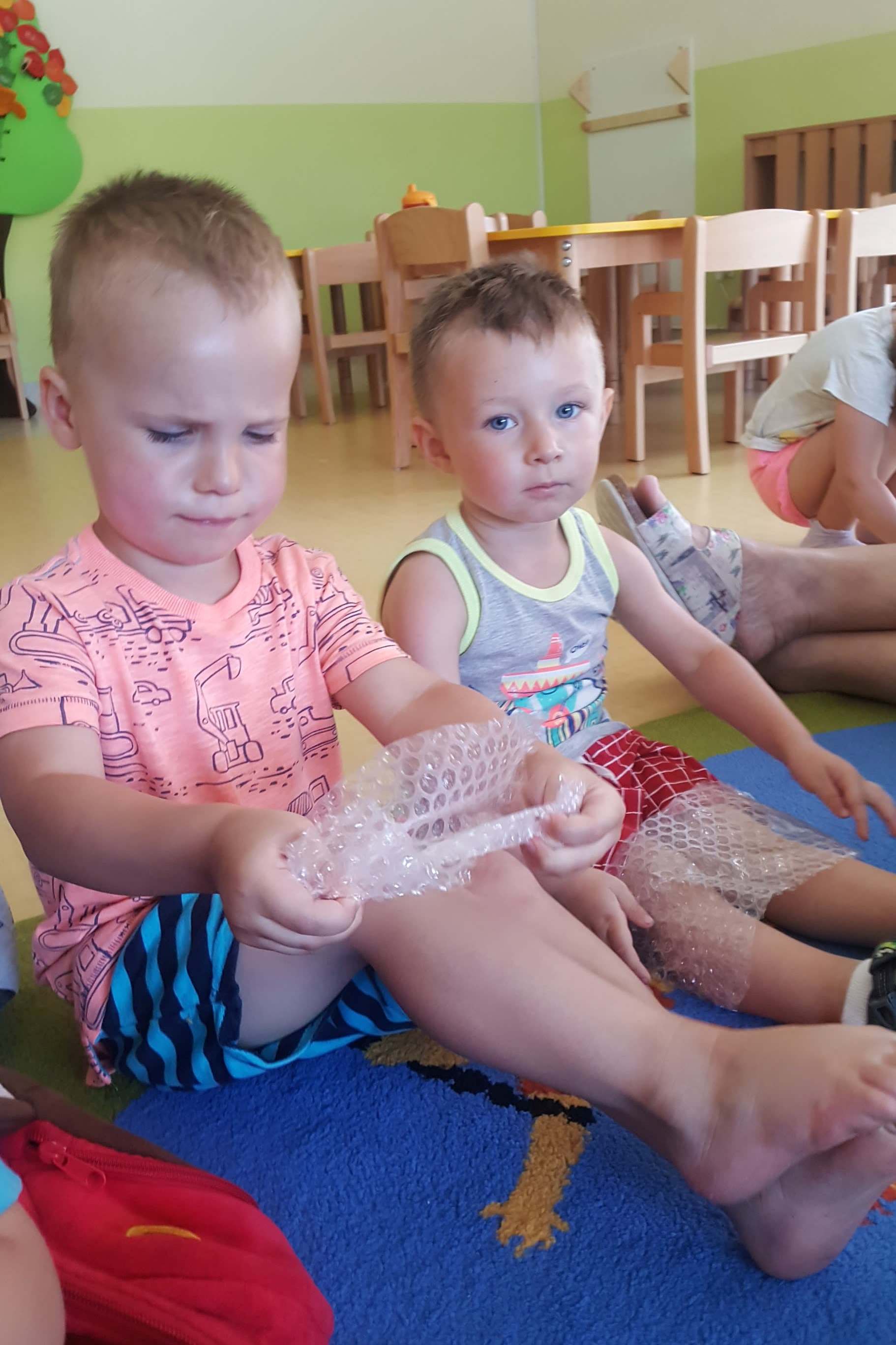 Wakacje już trwają a my wcale nie odpoczywamy. Na zajęciach sensorycznych bawiliśmy się cieczą nienewtonowską, która pod wpływem nacisku zmienia swoje właściwości. Do jej przygotowania wystarczy skrobia ziemniaczana i woda. A jeśli chcemy uzyskać kolor dodajemy barwnik. Trzeba przyznać, że oprócz świetnej zabawy to także miłe odprężenie dla dłoni. Z kolei na kolejnych zajęciach królowała folia bąbelkowa; można było po niej biegać, skakać gołymi stópkami, a potem ściskać w rączkach – jak wiadomo dla naszych żłobkowiczów to były niesamowite doznania. Dzieciaczki były zadowolone, co widać na załączonych zdjęciach.