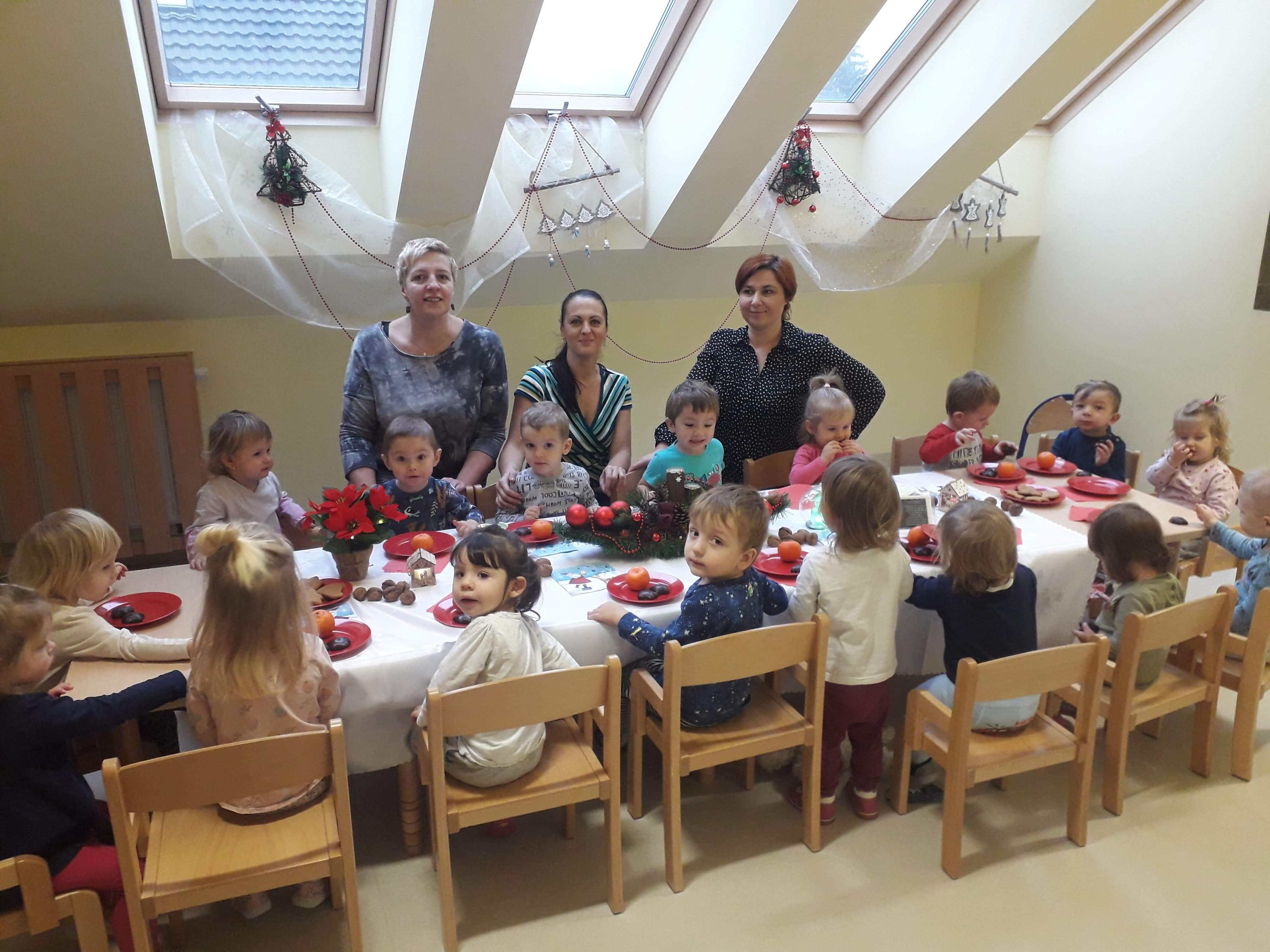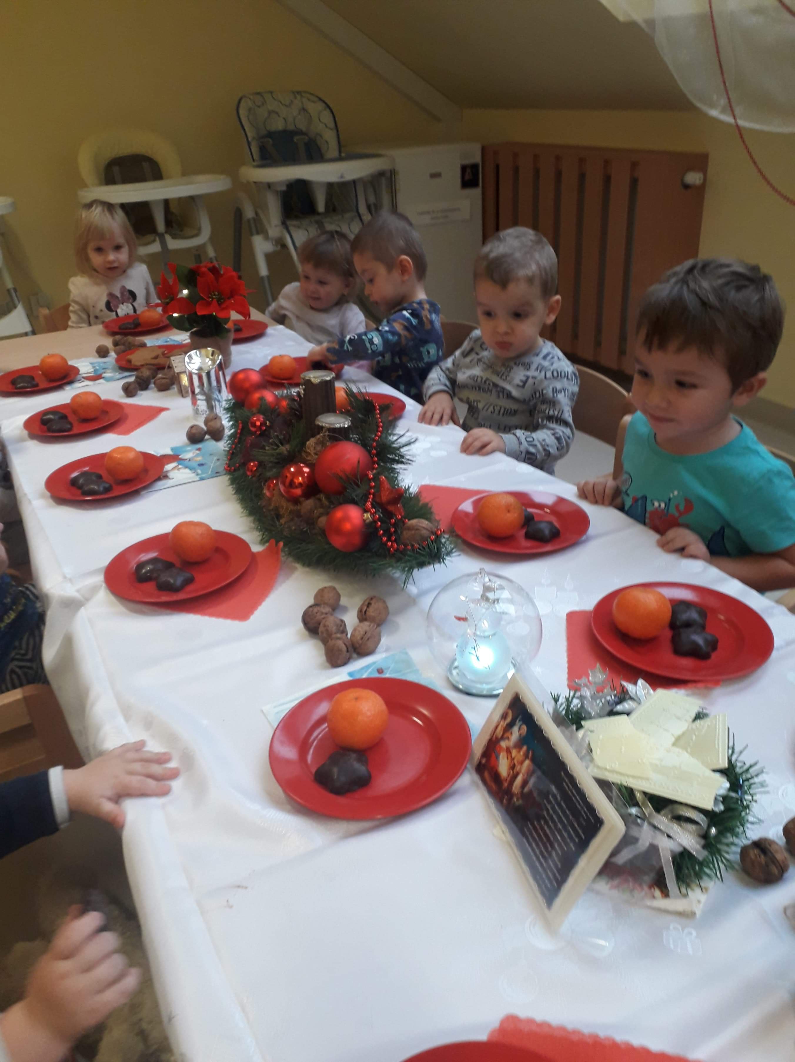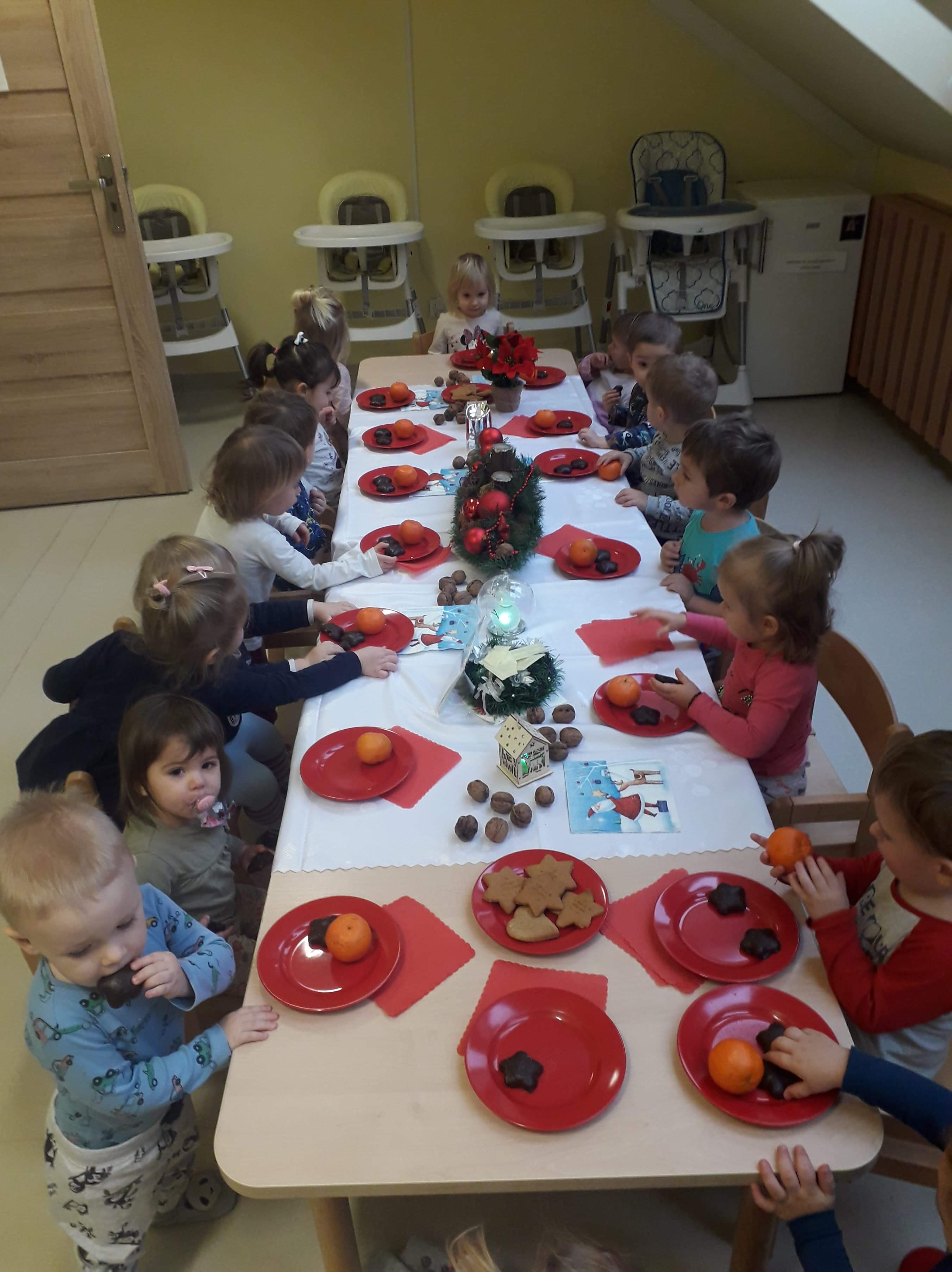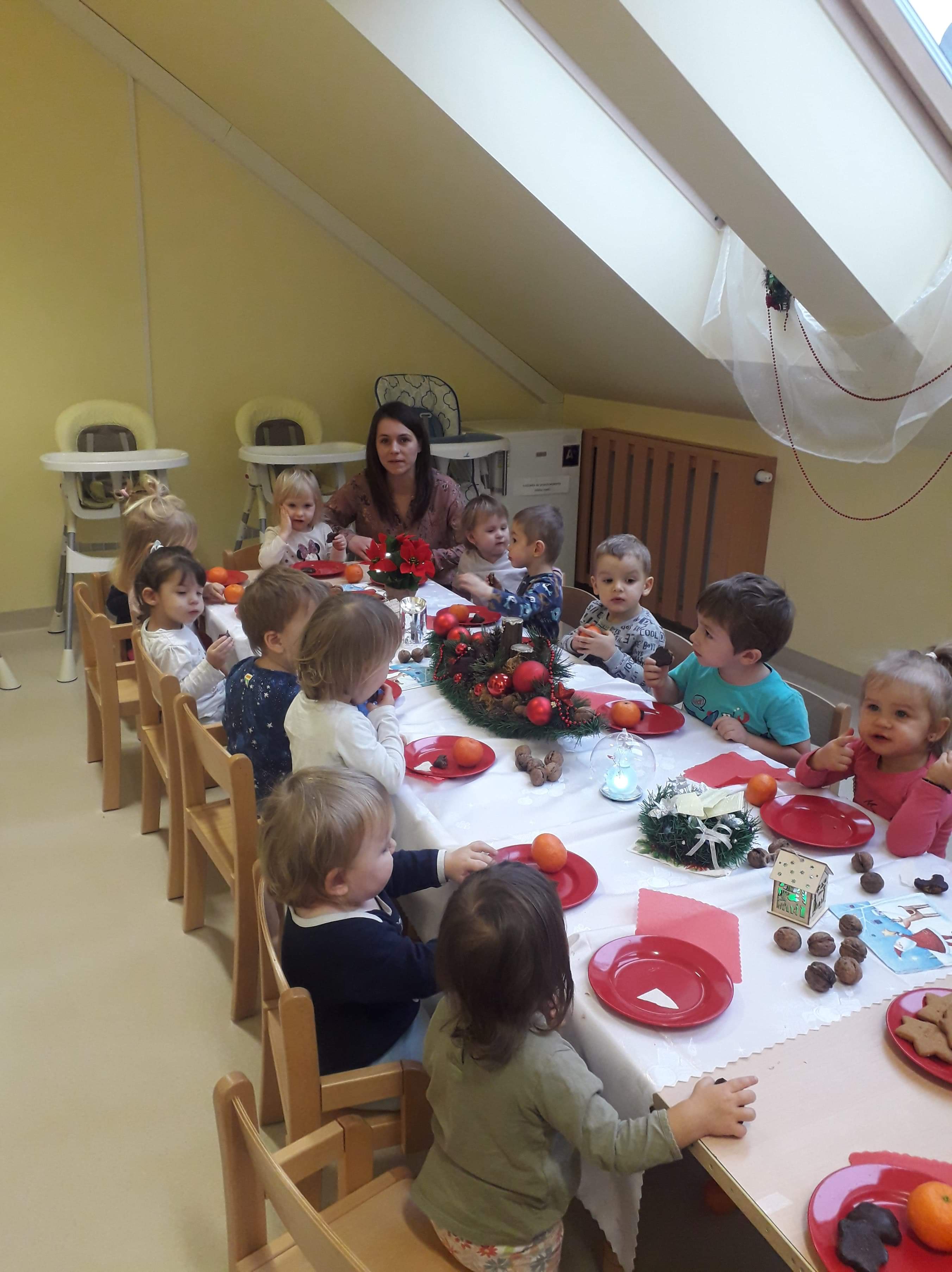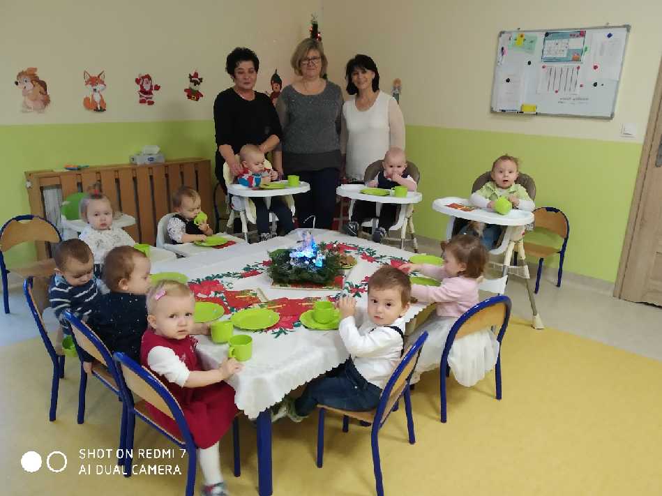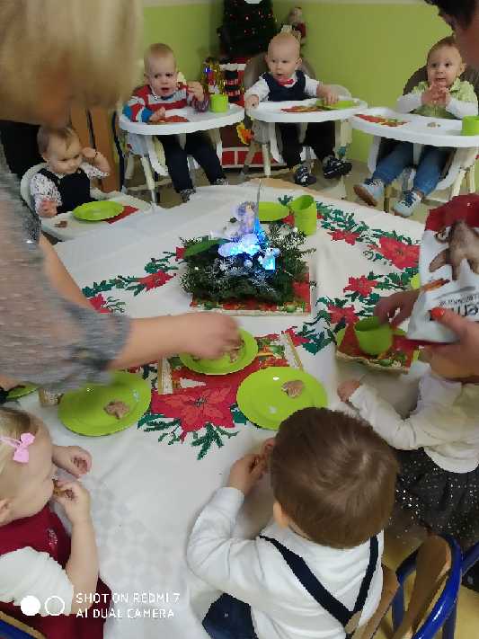 Zanim zaświeci pierwsza gwiazda i nasze maluszki zasiądą z rodzicami przy wigilijnym stole, zaprosiliśmy ich do udziału w żłobkowej wigilii. Było uroczyście, świątecznie, na stole nie zabrakło opłatka i uśmiechu na buziach dzieci. Ciocie zadbały o wystrój, by już dziś można było poczuć magię zbliżających się świąt…