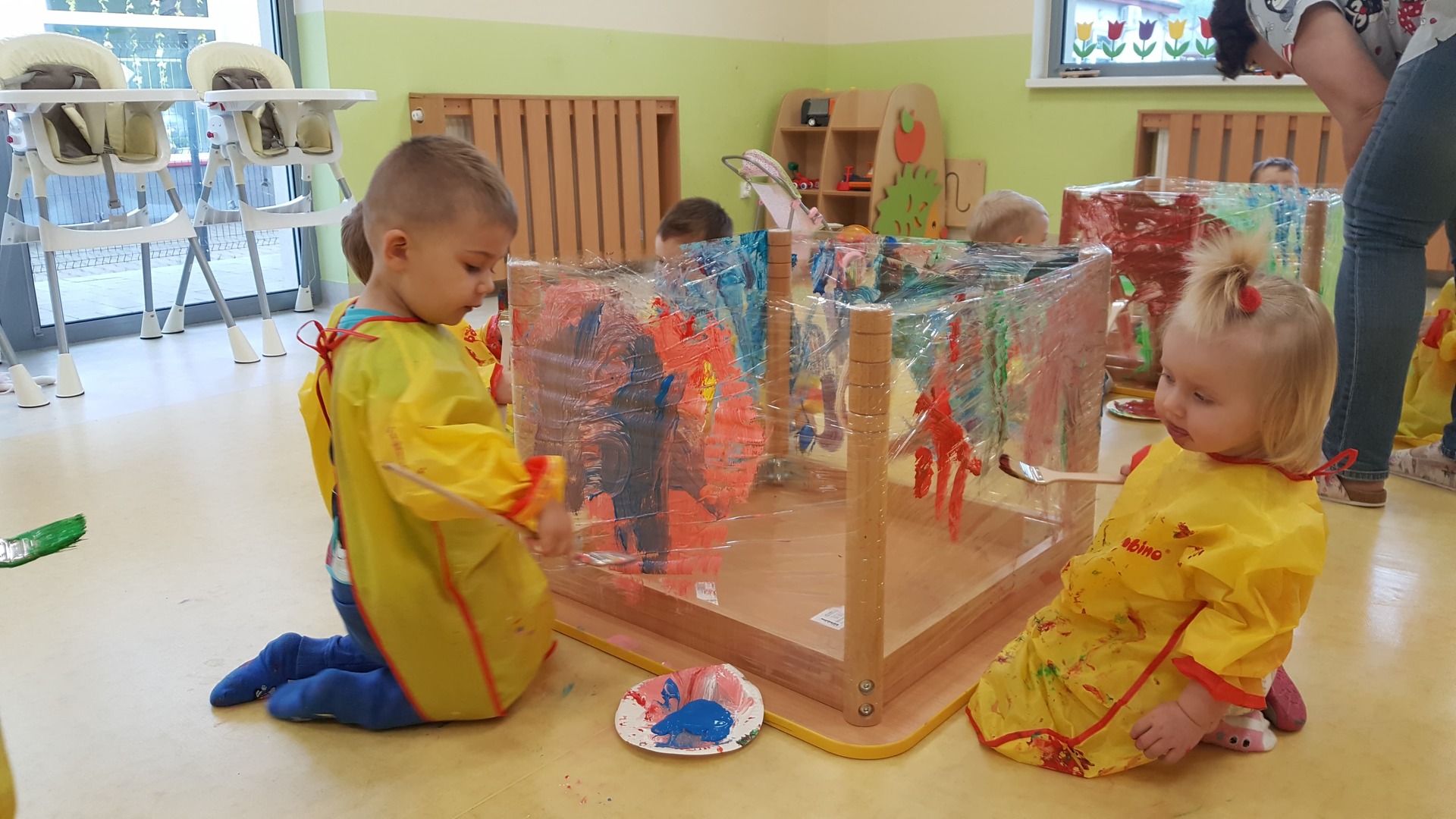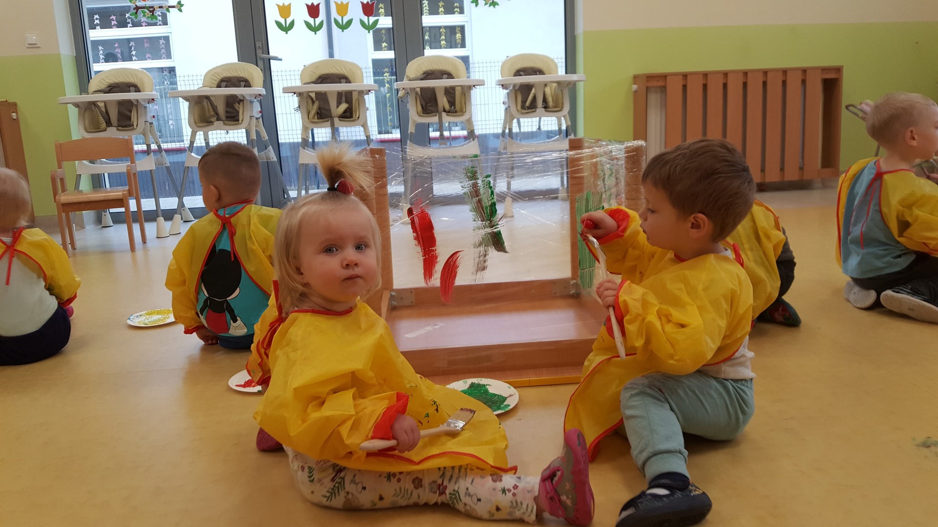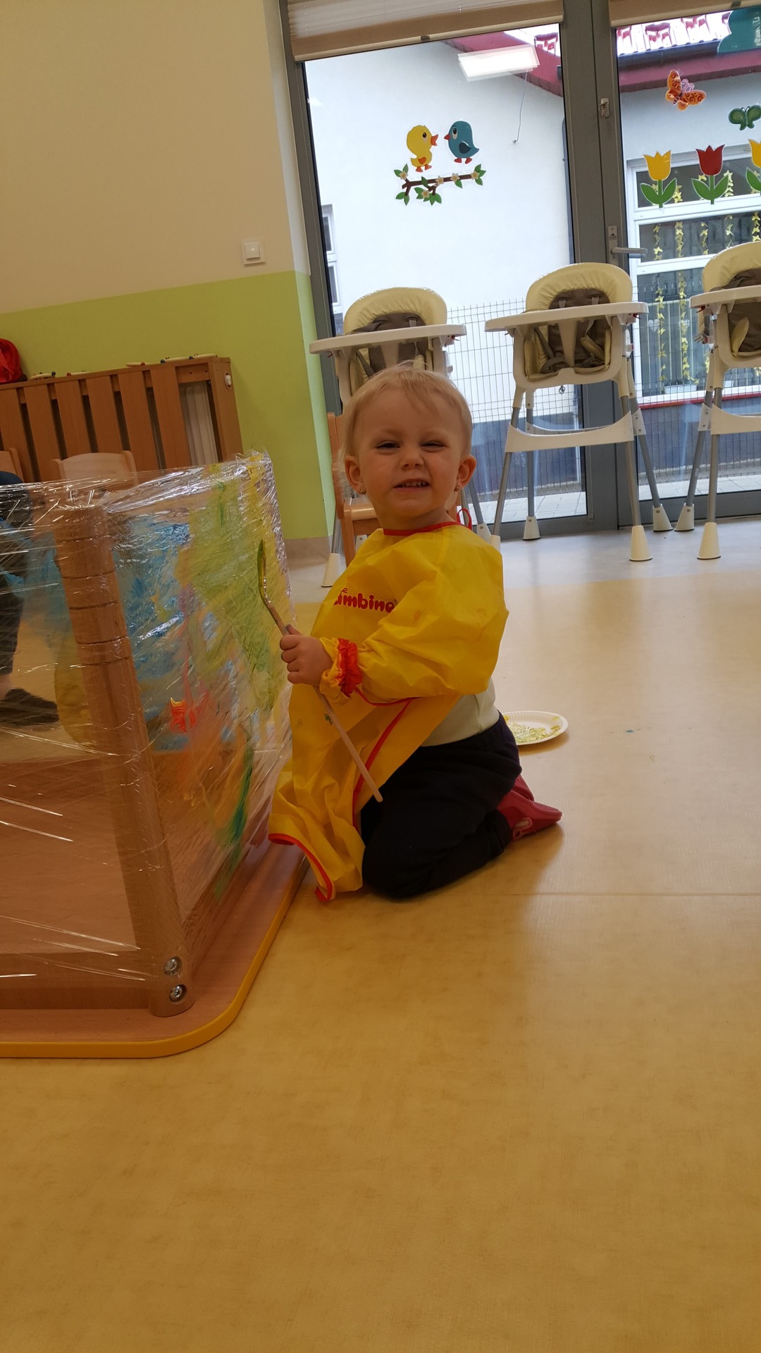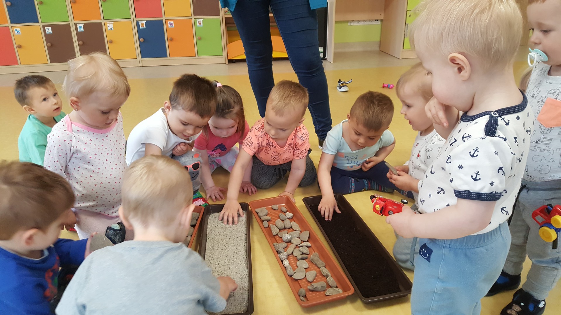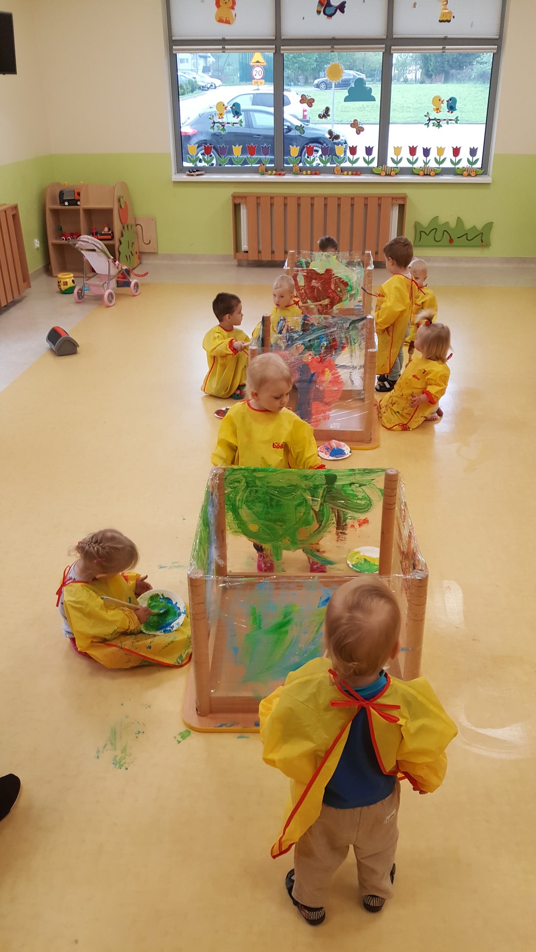 W majowy dzień sala żłobkowa zamieniła się w piękną łąkę, w ruch poszły pędzle i farba … Wiosenna łąka prezentowała się znakomicie! Następnie w sali zabaw pojawił się piasek, kamyki, ziemia. Można było dotykać, bawić się, doświadczać a potem przyszedł czas na wiosenne porządki… Dzieci uczyły się segregować śmieci...