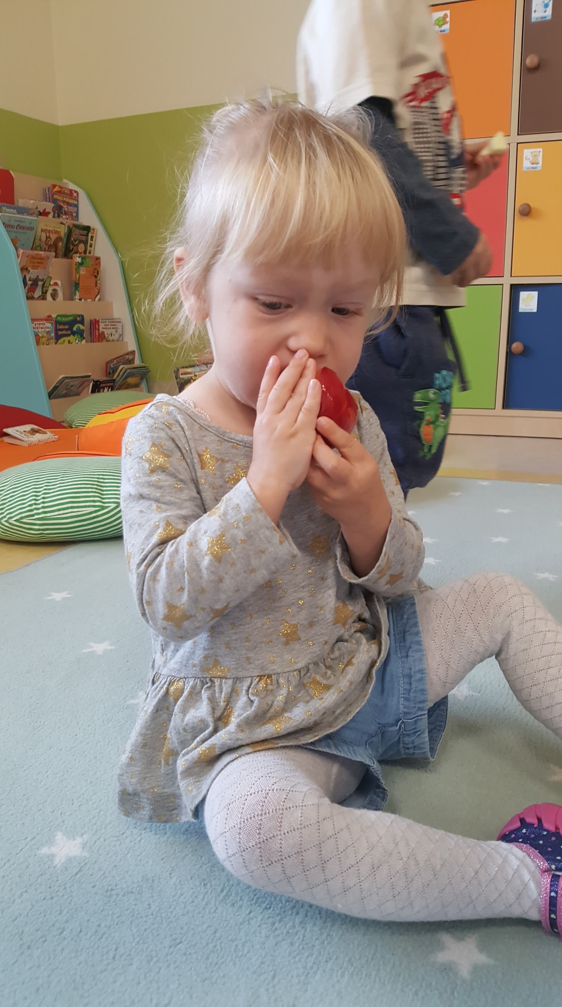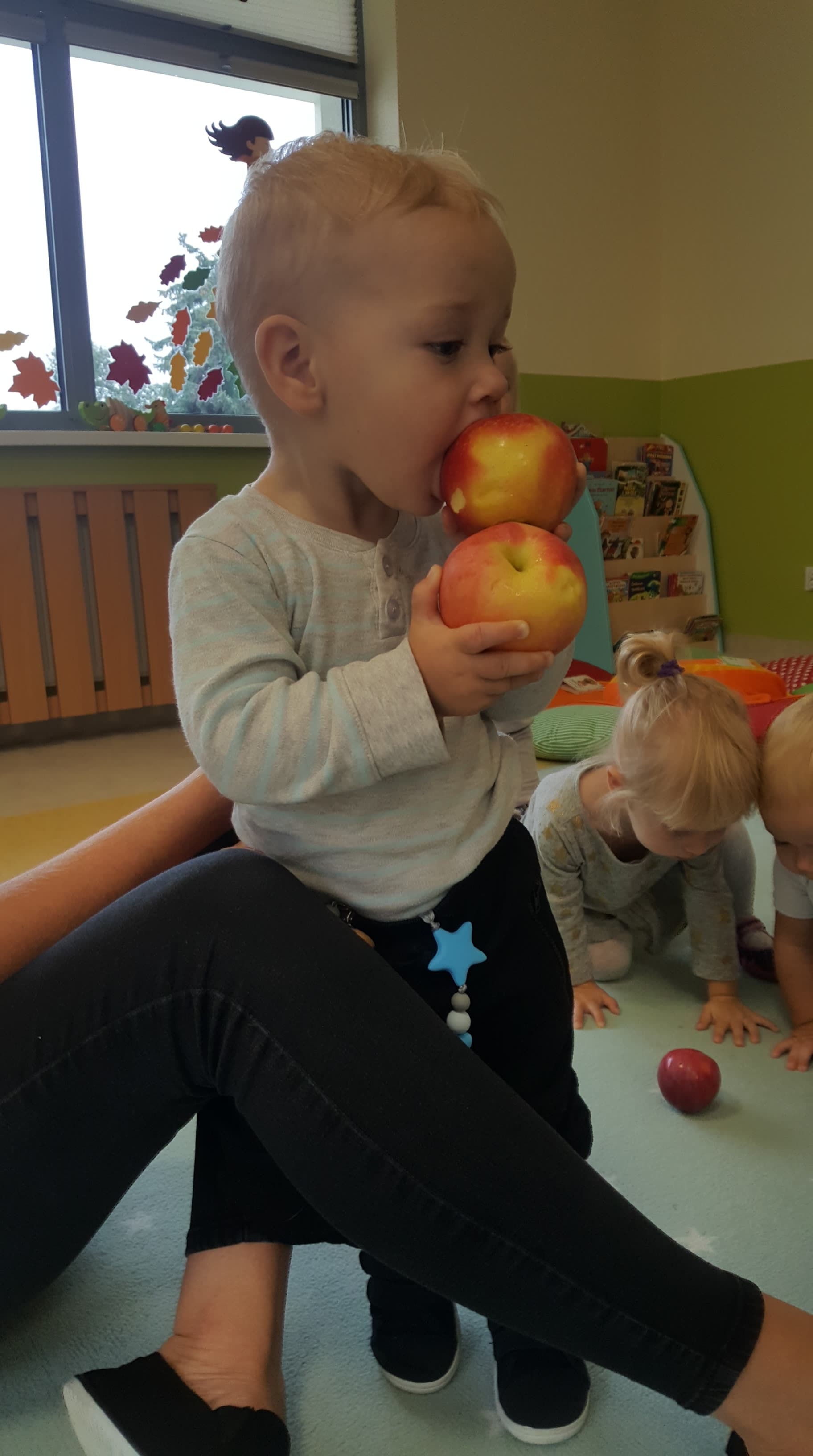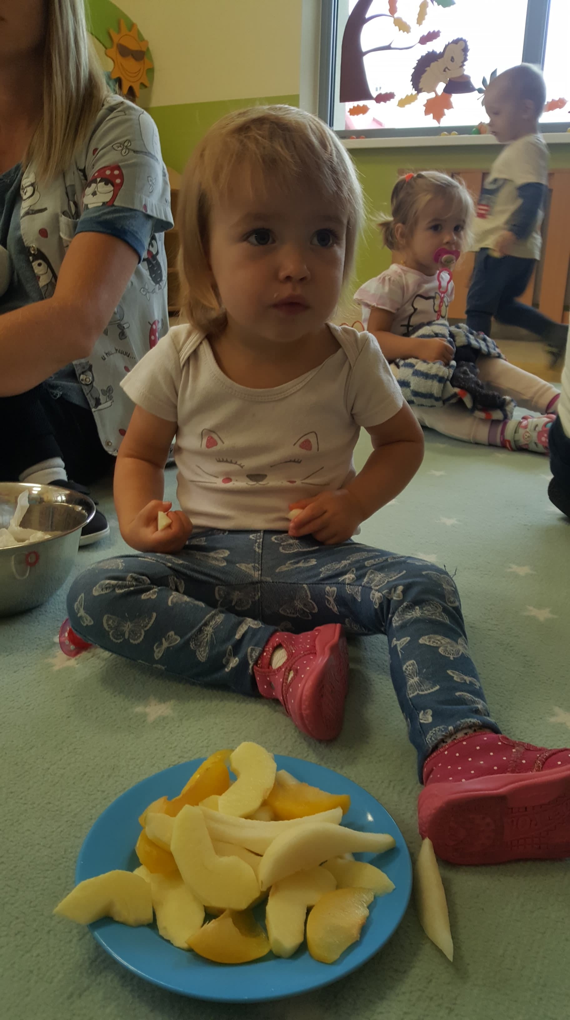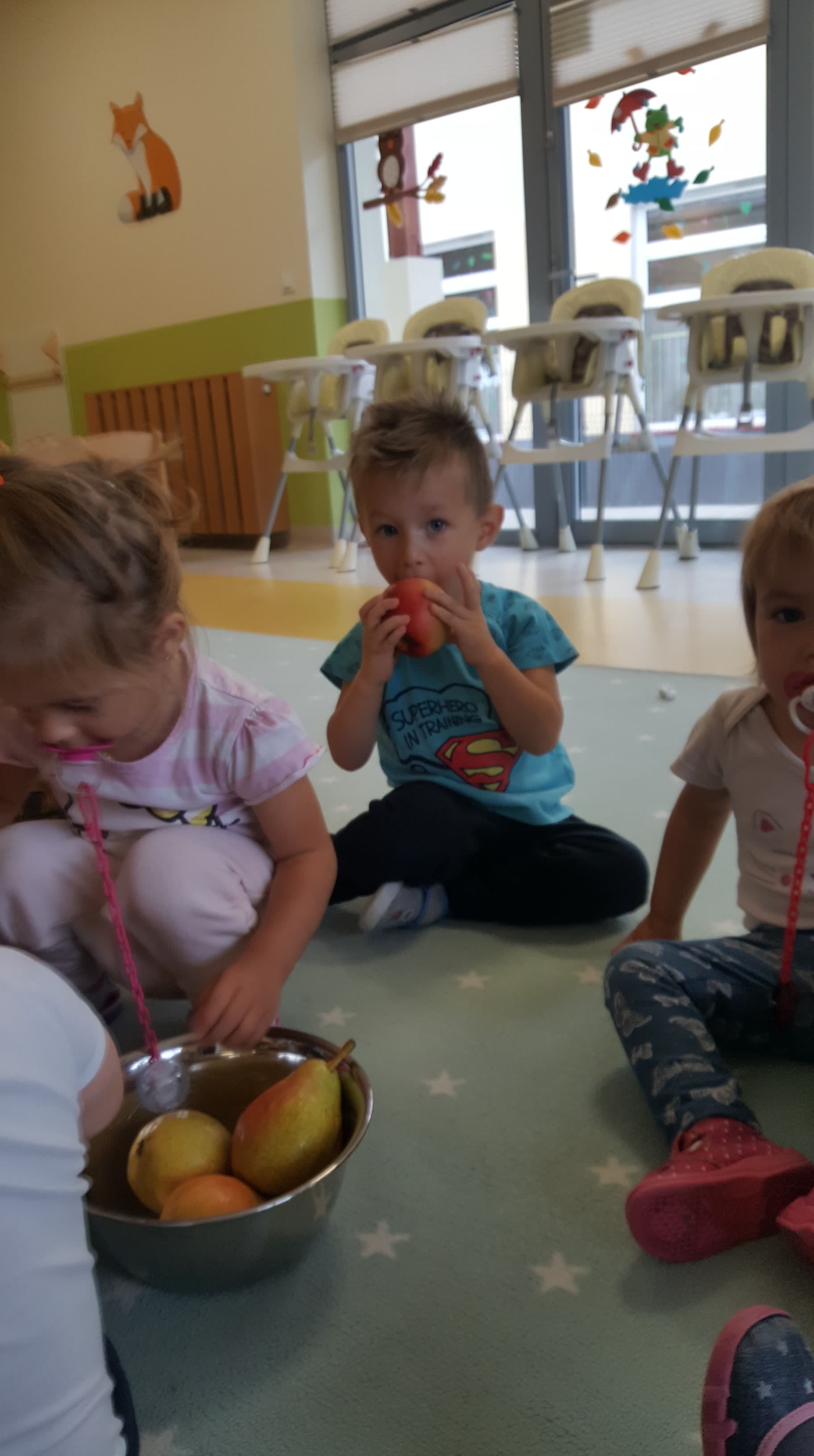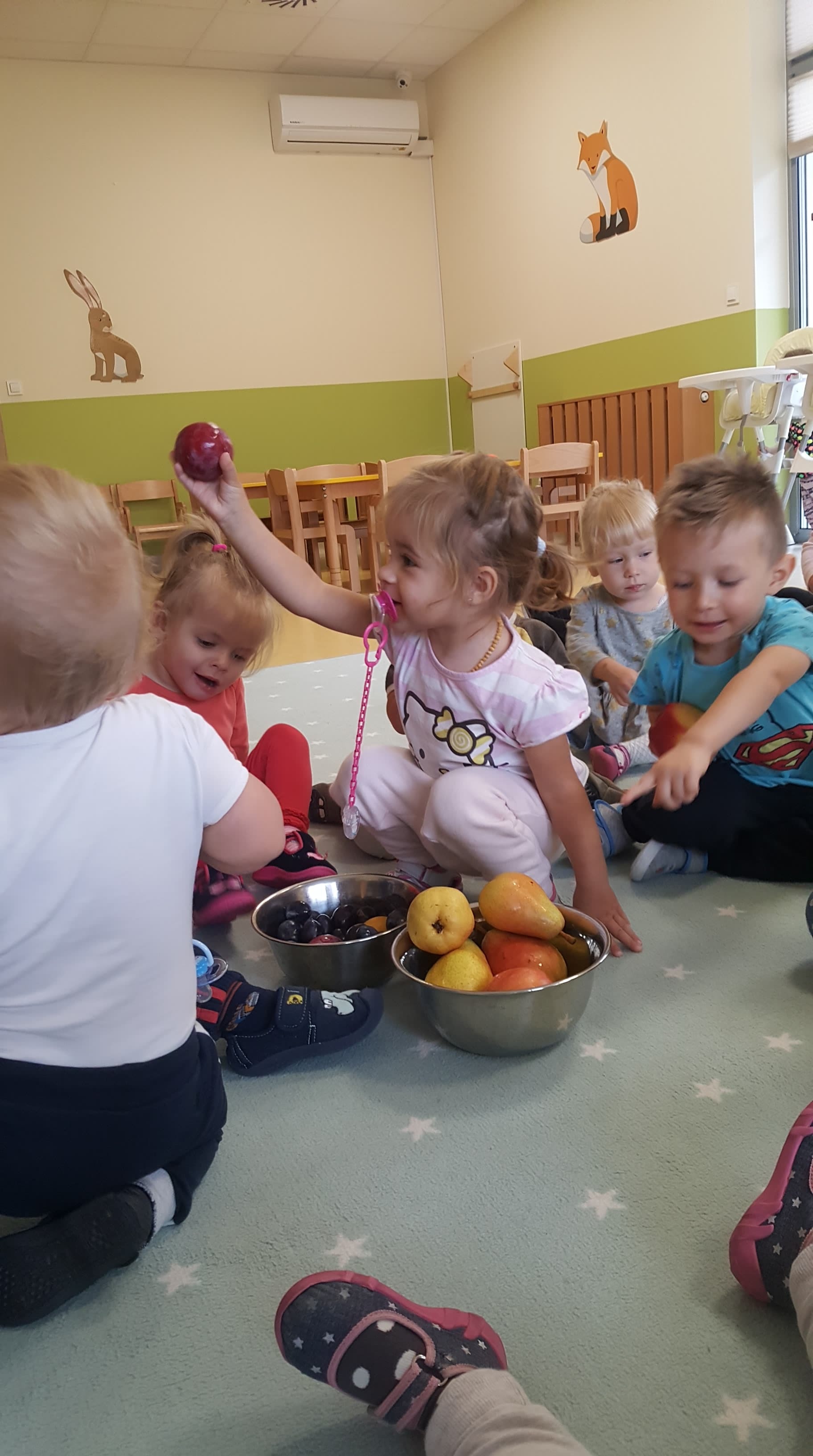 Wrzesień upływa nam na zabawach na placu zabaw, a w bardziej pochmurne dni bawimy się sensorycznie. Na początek w ruch poszły oczywiście farby, potem ciocie stworzyły worki sensoryczne, butelki sensoryczne, a zmysł smaku milusińscy kształtowali poprzez próbowanie różnych owoców. Było pysznie!